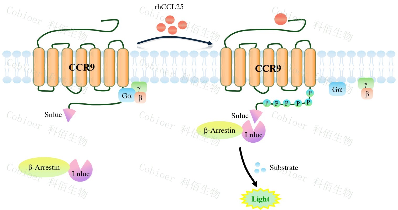 CCR9 β-Arrestin CHO 報(bào)告基因藥靶模型很好的模擬了體內(nèi) CCR9/β-Arrestin 的信號(hào)轉(zhuǎn)導(dǎo)過程,原理見下圖所示。當(dāng)缺乏配體刺激時(shí),β-Arrestin 不與 CCR9 結(jié)合,融合β-Arrestin 的熒光素酶處于失活構(gòu)象,當(dāng) CCR9 遭遇配體刺激時(shí),融合熒光素酶報(bào)告基因的β-Arrestin 被招募,使熒光素酶報(bào)告基因處于激活狀態(tài),加入其底物后發(fā)光信號(hào)增強(qiáng)。![]() Figure 1. CCR9 β-Arrestin CHO 細(xì)胞模型原理圖 |