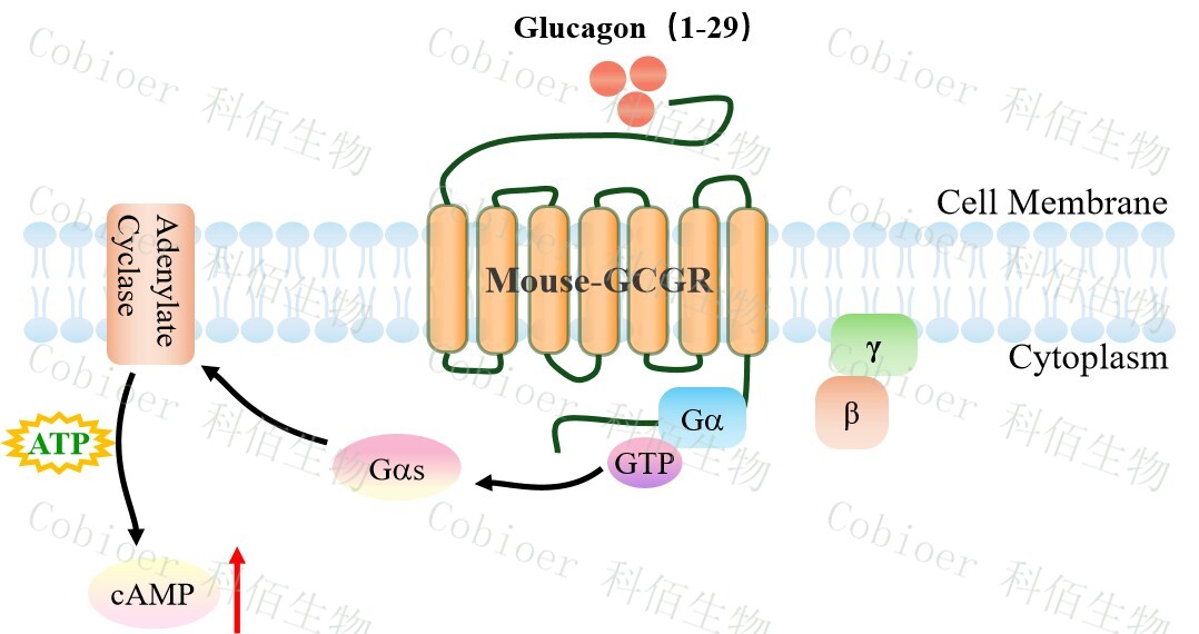 cAMP 在 G 蛋白偶聯(lián)受體(GPCR)信號轉(zhuǎn)導中是一種關(guān)鍵的第二信使。當配體結(jié)合到 GPCR,構(gòu)象發(fā)生變化,激活受體接著激活 G 蛋白,Gs 的激活導致腺苷酸環(huán)化酶調(diào)控 cAMP 的升高。Mouse GCGR CHO 藥靶模型很好的模擬了體內(nèi) GCGR 的信號轉(zhuǎn)導過程,原理見下圖所示。![]() Figure 1.Mouse GCGR CHO 細胞模型原理圖