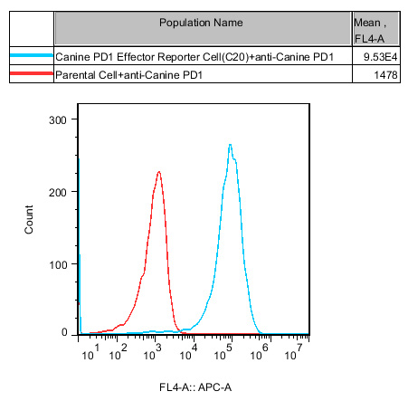 Canine PD1 Effector Reporter Cell 報(bào)告基因藥靶模型很好的模擬了體內(nèi) PD1&PDL1 的 信號(hào)轉(zhuǎn)導(dǎo)過程,原理圖見下圖所示。![]() Figure 1. Canine PD1 Effector Reporter Cell 細(xì)胞模型原理圖
