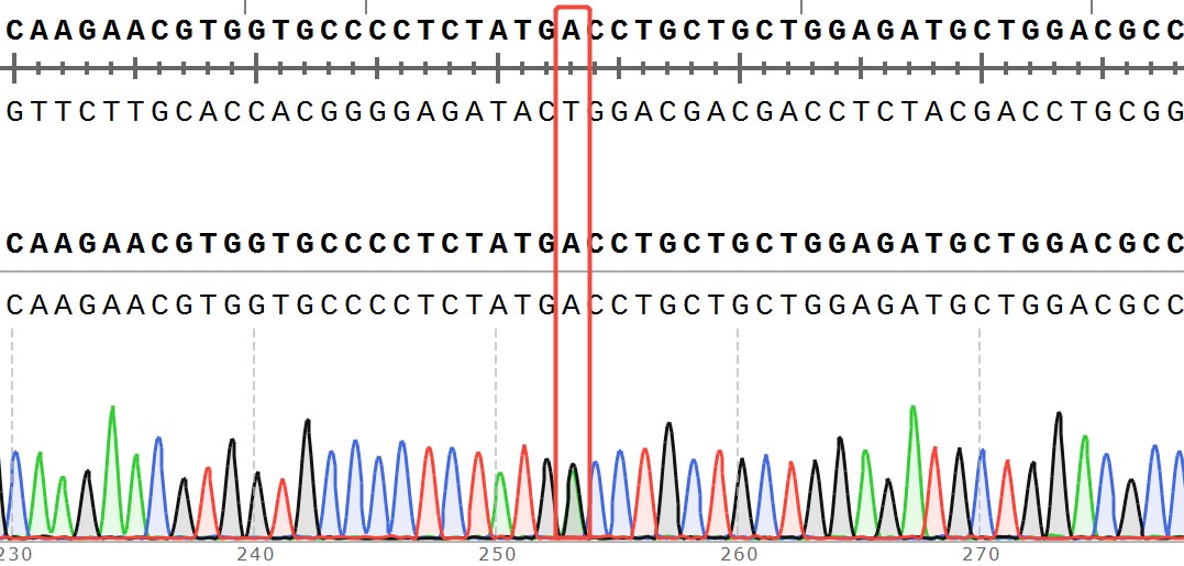 ESR1[D538G](Heterozygous,AF%66.7) Isogenic MCF7 藥靶細(xì)胞,通過基 因編輯的方式將 ESR1 的 538 位氨基酸天冬氨酸(D)突變?yōu)楦拾彼幔℅)。![]() Figure 1. ESR1[D538G](Heterozygous,AF%66.7) Isogenic MCF7 原理示意圖 |