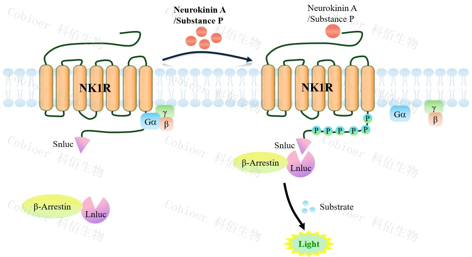 NK1R β-Arrestin CHO 報告基因藥靶模型很好的模擬了體內(nèi) NK1R/β-Arrestin 的信號轉(zhuǎn) 導過程,原理見下圖所示。當缺乏配體刺激時,β-Arrestin 不與 NK1R 結(jié)合,融合β-Arrestin的熒光素酶處于失活構(gòu)象,當 NK1R 遭遇配體刺激時,融合熒光素酶報告基因的β-Arrestin 被招募,使熒光素酶報告基因處于激活狀態(tài),加入其底物后發(fā)光信號增強。![]() Figure 1. NK1R β-Arrestin CHO 細胞模型原理圖 |