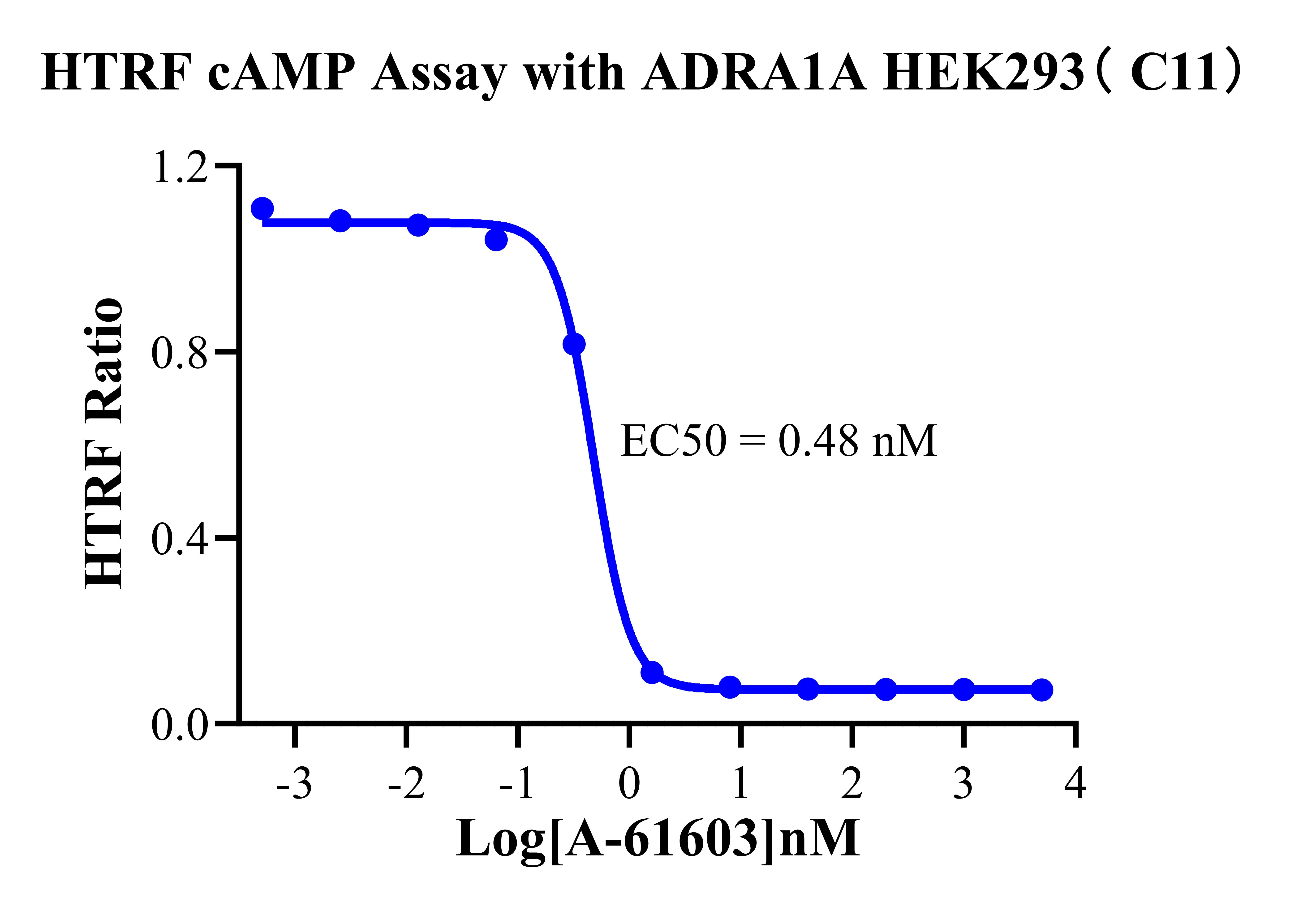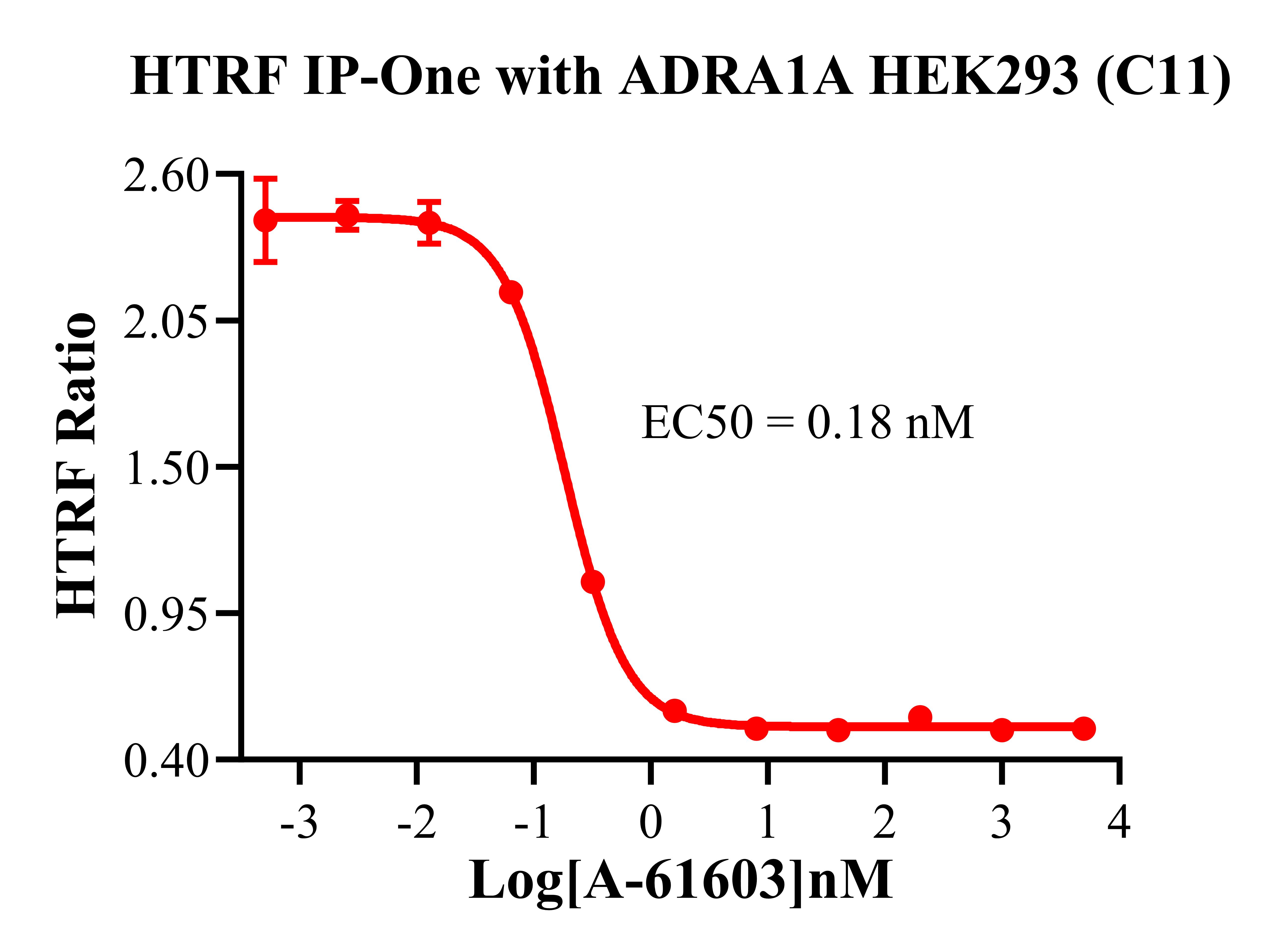ADRA1A 還可以通過 Gq 蛋白的信號通路,調(diào)控 IP1 的升高。ADRA1A 與配體結(jié)合, 導(dǎo)致 Gαq 亞基的激活,觸發(fā) PLC-γ,從而產(chǎn)生兩個第二信使:IP3 和 DAG,它們參與細胞 內(nèi)鈣動員。由于 IP3 在代謝上不穩(wěn)定,因此測量通路激活的替代標志物 IP1 作為檢測標準。