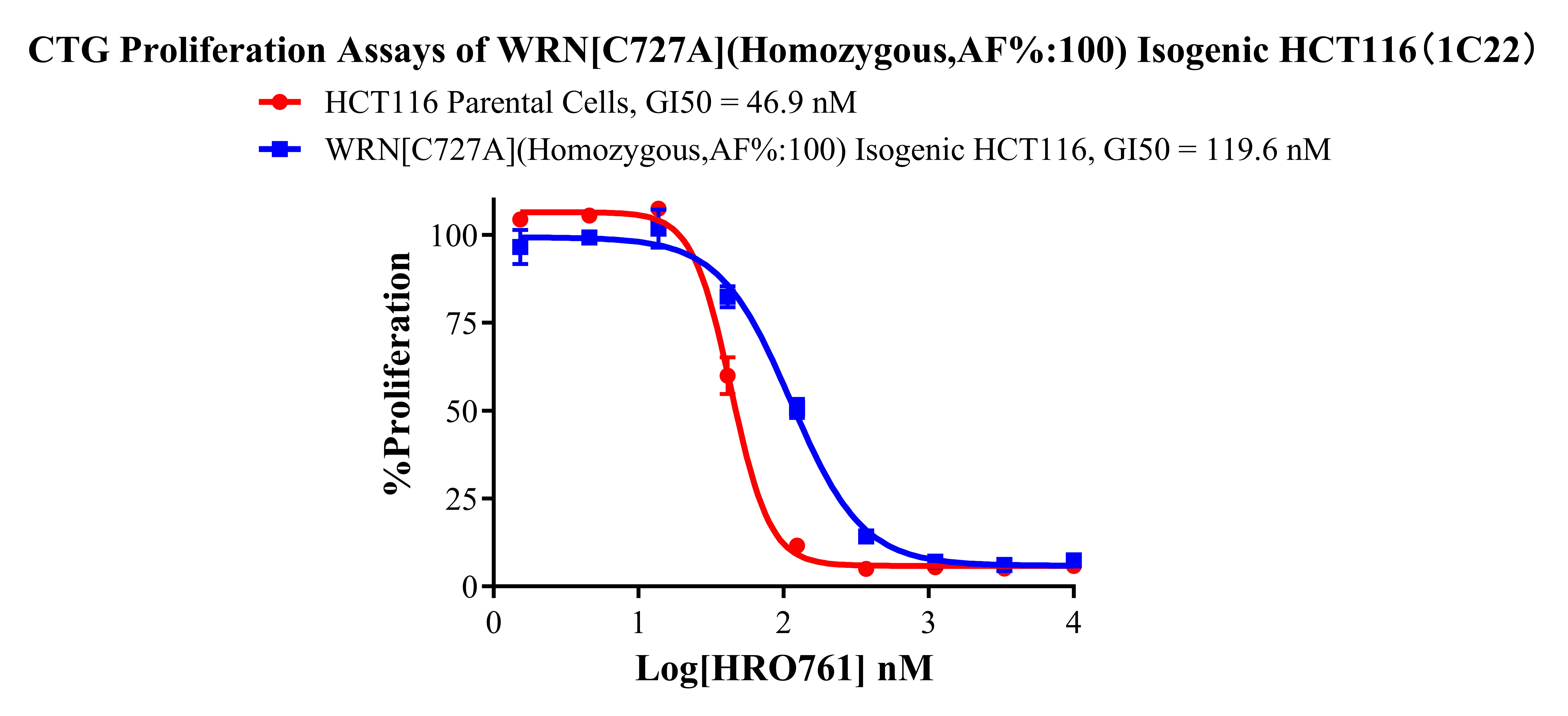 ![]() Figure 2. Sanger of WRN[C727A](Homozygous,AF%:100) Isogenic HCT116 ![]() Figure 3. A:HCT116 Parental Cell;B:WRN[C727A](Homozygous,AF%:100) Isogenic HCT116 通道2 藍(lán)色微滴代表WRN[C727A]突變陽(yáng)性,通道2 綠色微滴代表該位點(diǎn)為陰性野生型 ![]() Figure 4. CTG Proliferation Assays of WRN[C727A](Homozygous,AF%:100) Isogenic HCT116(1C22). ![]() Figure 5. CTG Proliferation Assays of WRN[C727A](Homozygous,AF%:100) Isogenic HCT116(1C22). |