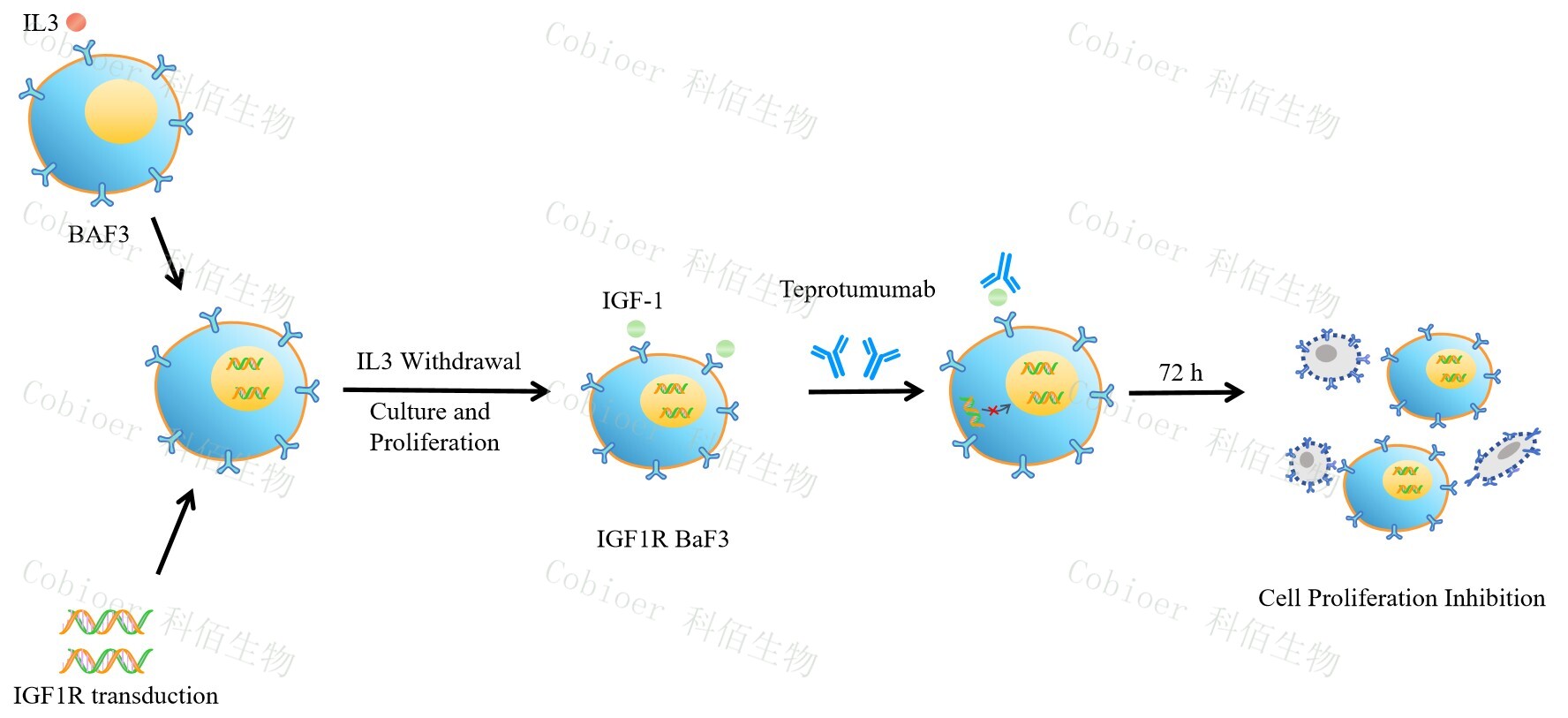 BaF3(小鼠原 B 細(xì)胞)的生長和增殖需要 IL-3 的維持。通過引入各種表達激酶的基因, 能作為 BaF3 的驅(qū)動基因,讓 BaF3 不再依賴 IL-3 而增殖,進而激酶基因成為 BaF3 增殖依 賴的驅(qū)動基因,用于評估小分子藥物對激酶的靶向抑制作用,原理及流程見下圖所示。![]() Figure 1. IGF1R BaF3 細(xì)胞模型原理圖 |
