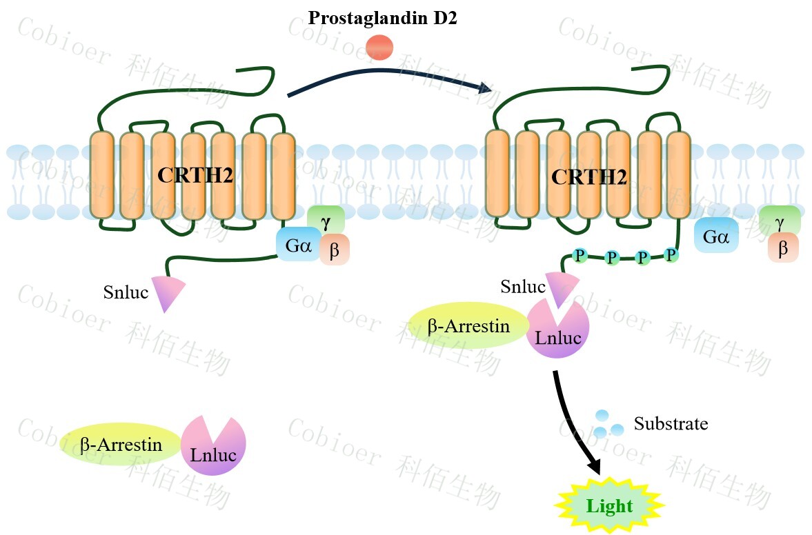 CRTH2(DP2) β-Arrestin CHO 報告基因藥靶模型很好的模擬了體內(nèi) CRTH2(DP2)/β- Arrestin 的信號轉(zhuǎn)導(dǎo)過程, 原理見下圖所示。 當(dāng)缺乏配體刺激時 , β-Arrestin 不與 CRTH2(DP2)結(jié)合,融合β-Arrestin 的熒光素酶處于失活構(gòu)象,當(dāng) CRTH2(DP2)遭遇配體刺 激時,融合熒光素酶報告基因的β-Arrestin 被招募,使熒光素酶報告基因處于激活狀態(tài),加 入其底物后發(fā)光信號增強。![]() Figure 1. CRTH2(DP2) β-Arrestin CHO 細(xì)胞模型原理圖 |