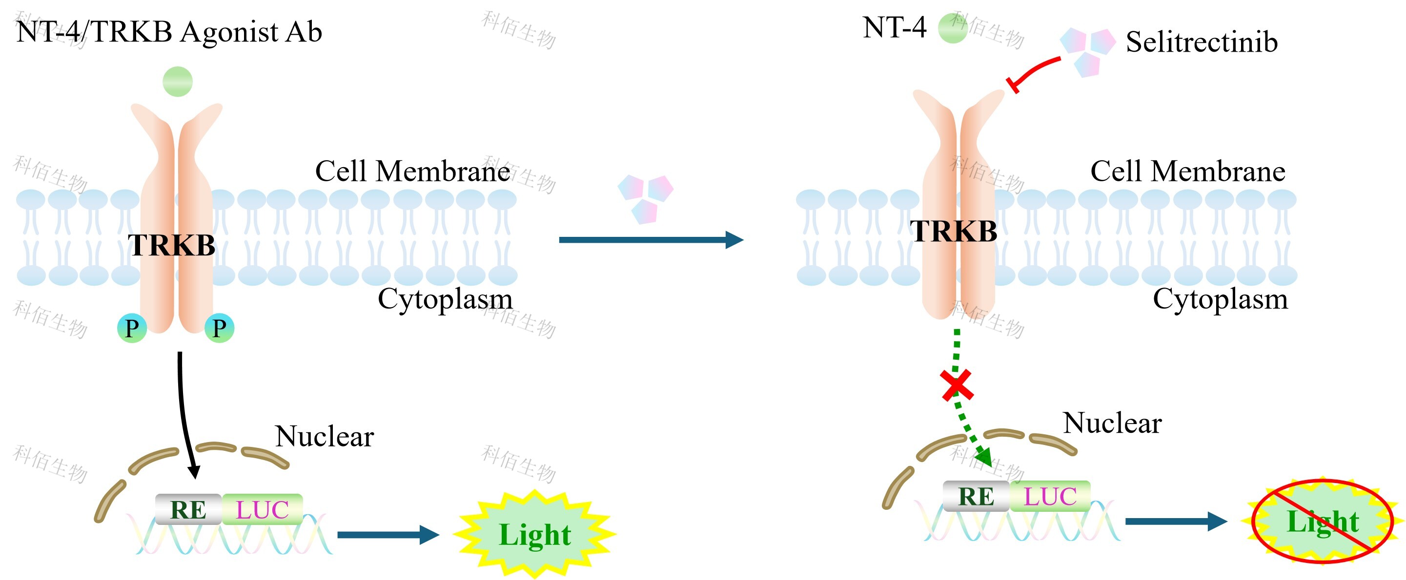 TRKB Effector Reporter Cell 報(bào)告基因藥靶模型很好的模擬了體內(nèi) TRKB 的信號(hào)轉(zhuǎn)導(dǎo)過(guò)程,原理見(jiàn)下圖所示。![]() Figure 1. TRKB Effector Reporter Cell 模型原理圖 |