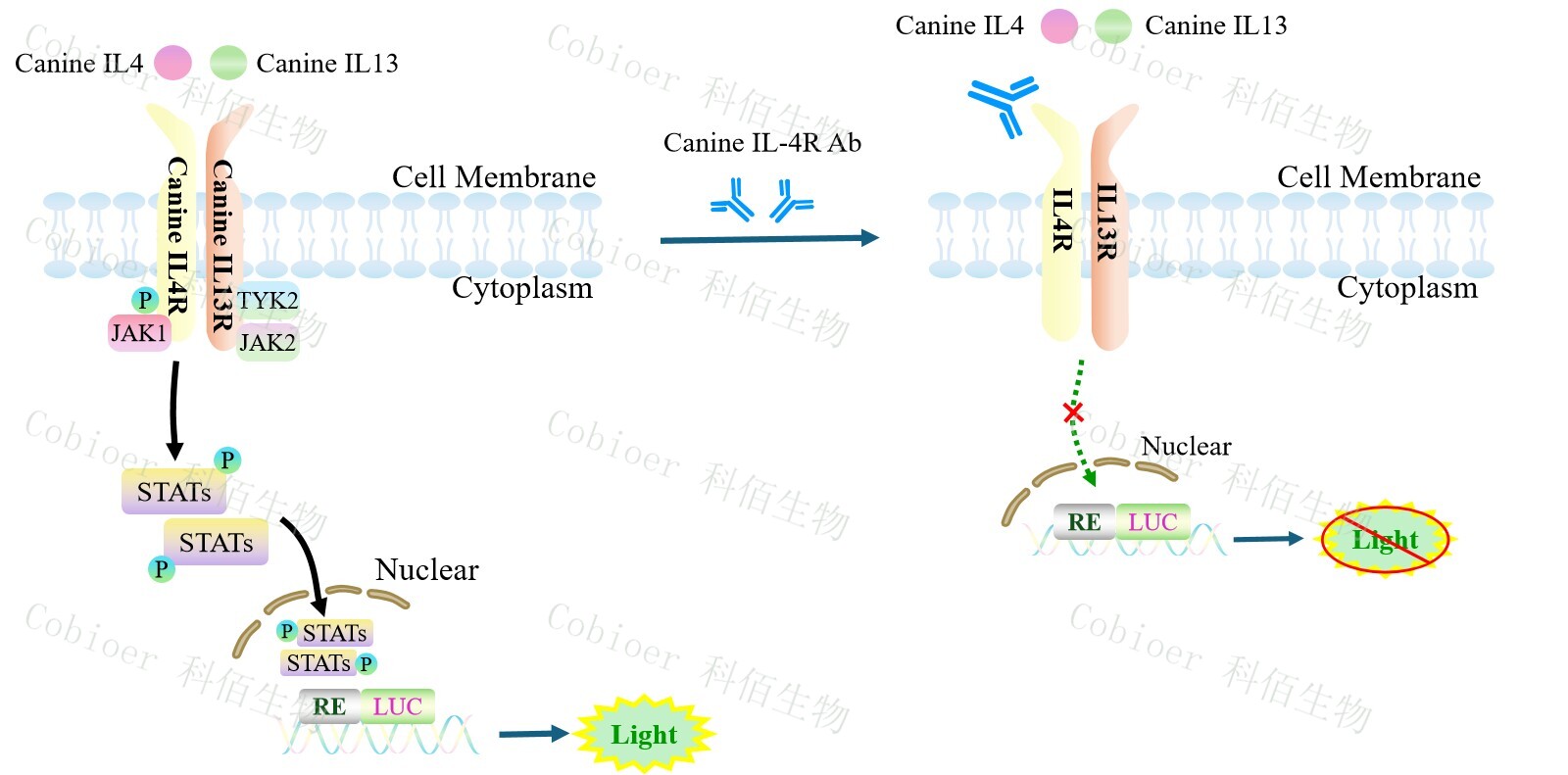 Canine IL4/IL13 Dual Effector Reporter Cell 報(bào)告基因藥靶模型很好的模擬了體內(nèi) IL4/IL13 的信號轉(zhuǎn)導(dǎo)過程,原理見下圖所示。![]() Figure 1. Canine IL4/IL13 Dual Effector Reporter Cell 細(xì)胞模型原理圖 |