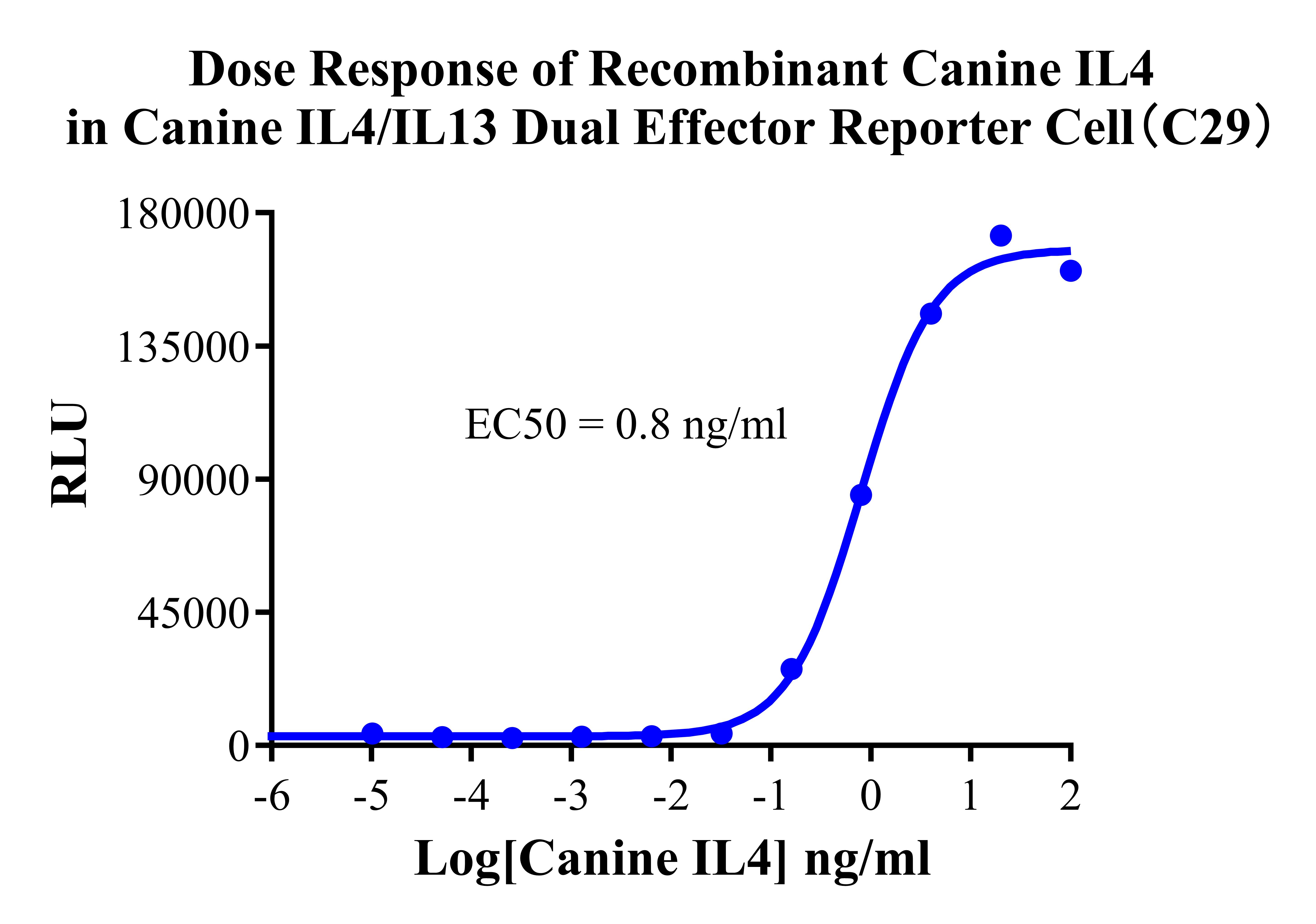 ![]() Figure 2. Dose Response of Recombinant Canine IL4 in Canine IL4/IL13 Dual Effector Reporter Cell(C29).