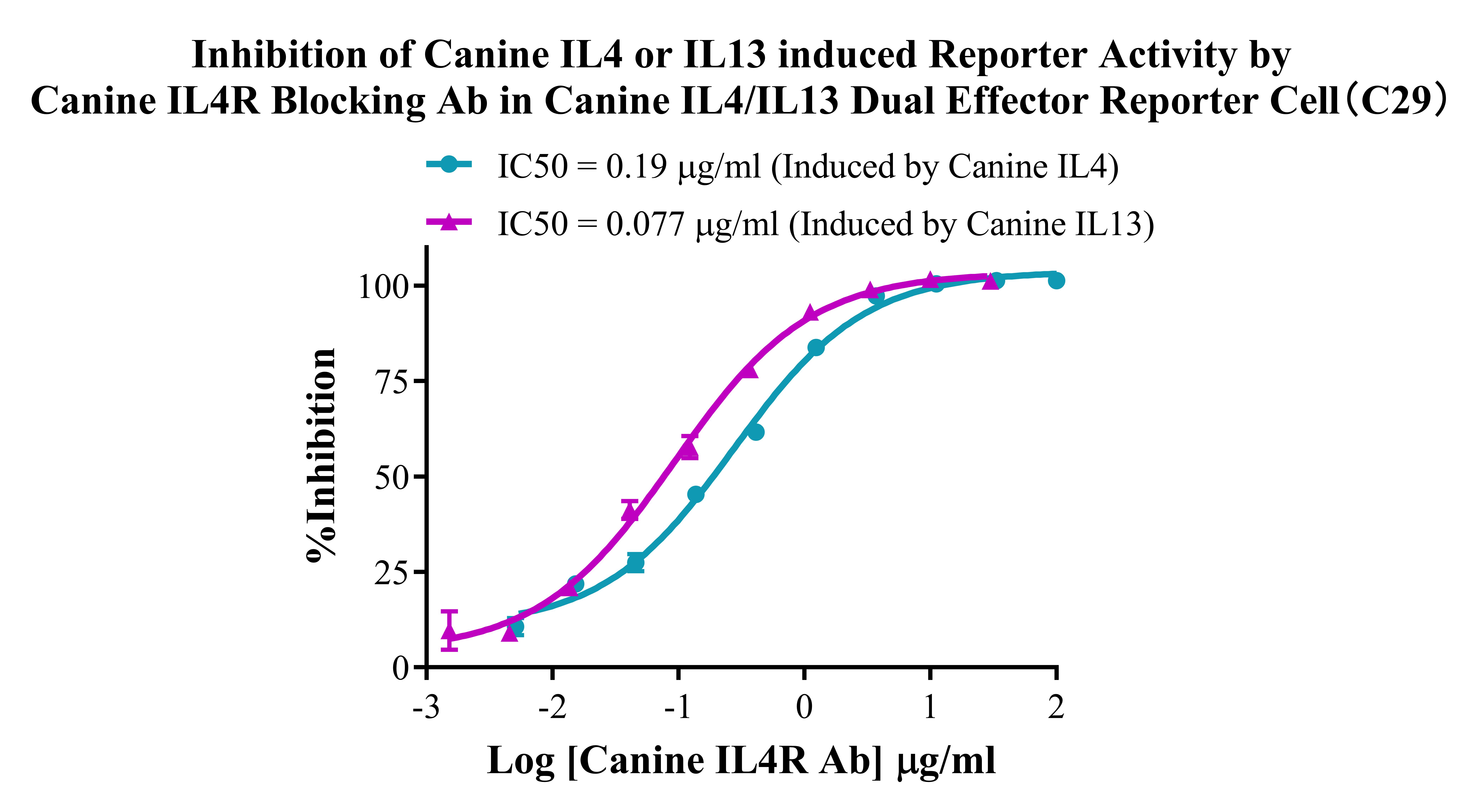 ![]() Figure 3. Dose Response of Recombinant Canine IL13 in Canine IL4/IL13 Dual Effector Reporter Cell(C29). ![]() Figure 4. Inhibition of Canine IL4 or IL13 induced Reporter Activity by Canine IL4R Blocking Ab in Canine IL4/IL13 Dual Effector Reporter Cell (C29). |