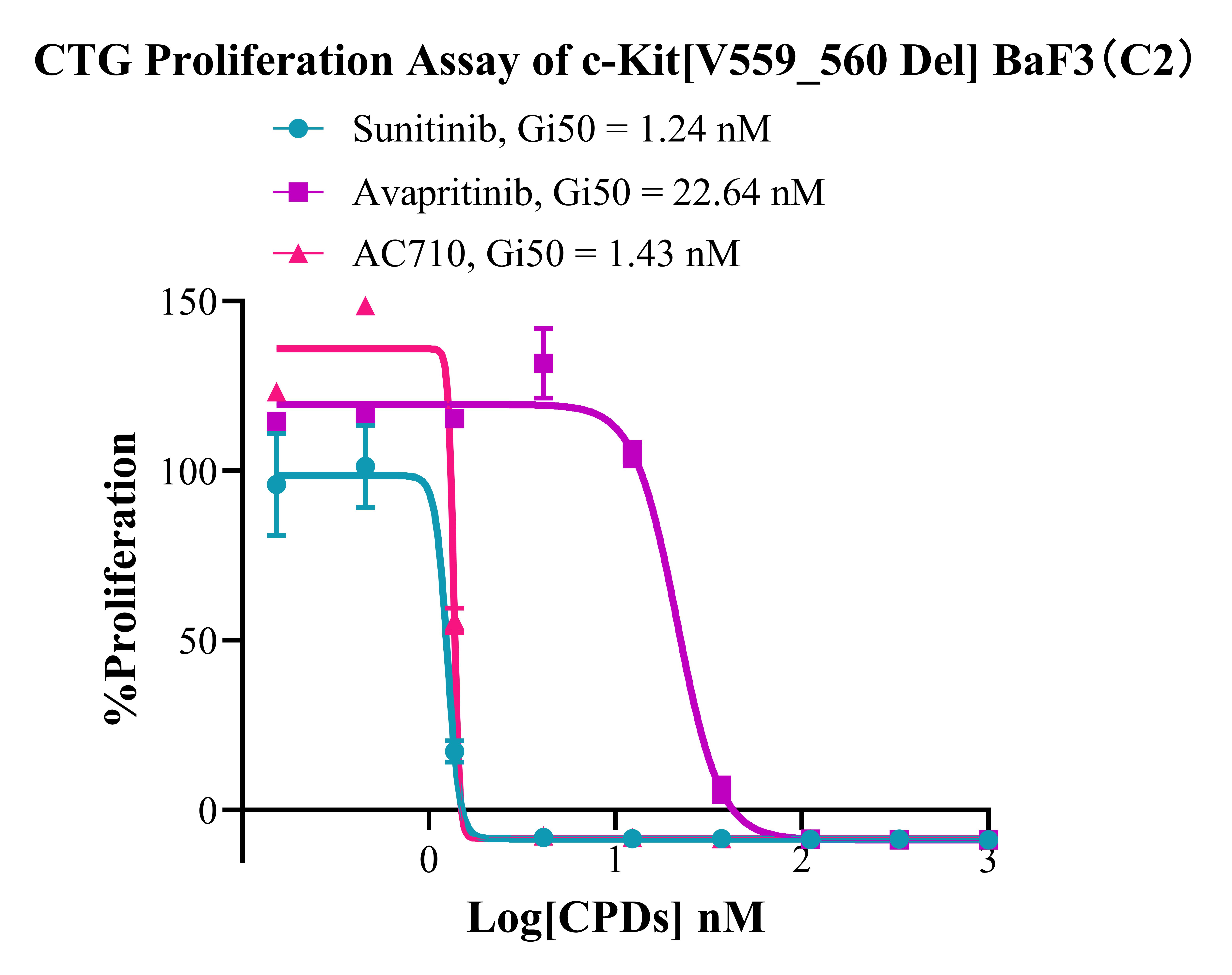 c-Kit[V559_560 Del] BaF3 藥 靶 細 胞 , 通過轉導缺失狀態(tài)的 c- Kit[V559_560 Del] 基因到 BaF3 細胞系中,穩(wěn)定表達人缺失形態(tài)下的 c-Kit[V559_560 Del] 基因。