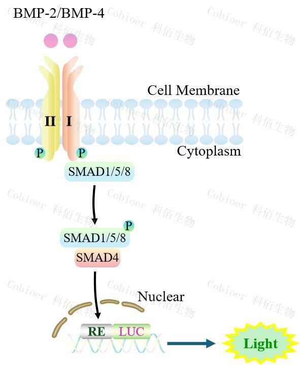 BMP Effector Reporter Cell 報告基因藥靶模型很好的模擬了體內(nèi) BMP 的信號轉(zhuǎn)導(dǎo)過程, 原理見下圖所示。![]() Figure 1. BMP Effector Reporter Cell 細(xì)胞模型原理圖 |