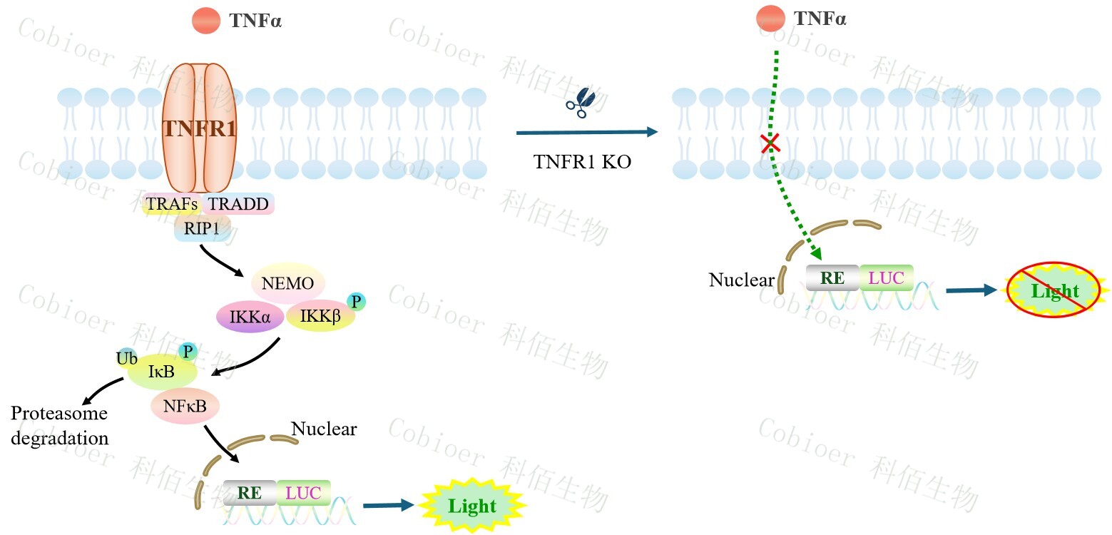 TNFR1 KO NFκB-Luc Jurkat 報告基因藥靶模型很好的模擬了體內(nèi) NFκB 的信號轉(zhuǎn)導(dǎo)過程,原理見下圖所示。![]() Figure 1. TNFR1 KO NFκB-Luc Jurkat 細(xì)胞模型原理圖 |