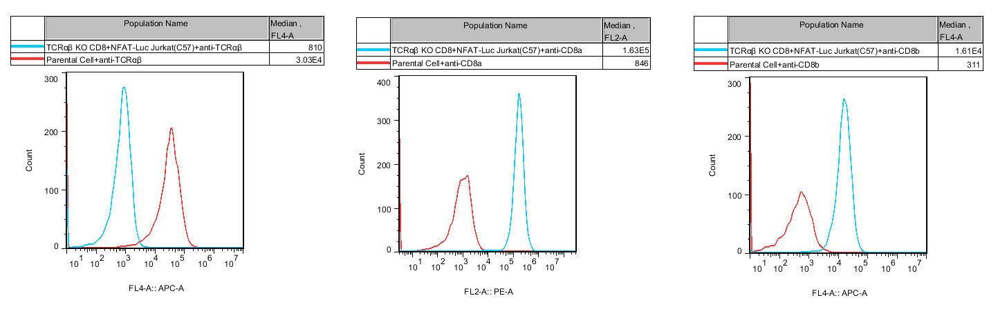 | TCRαβ KO CD8+ NFAT-Luc Jurkat 細(xì)胞,在 NFAT-Luc Jurkat 細(xì)胞上敲除 TCRαβ,表達(dá)CD8。 | |
