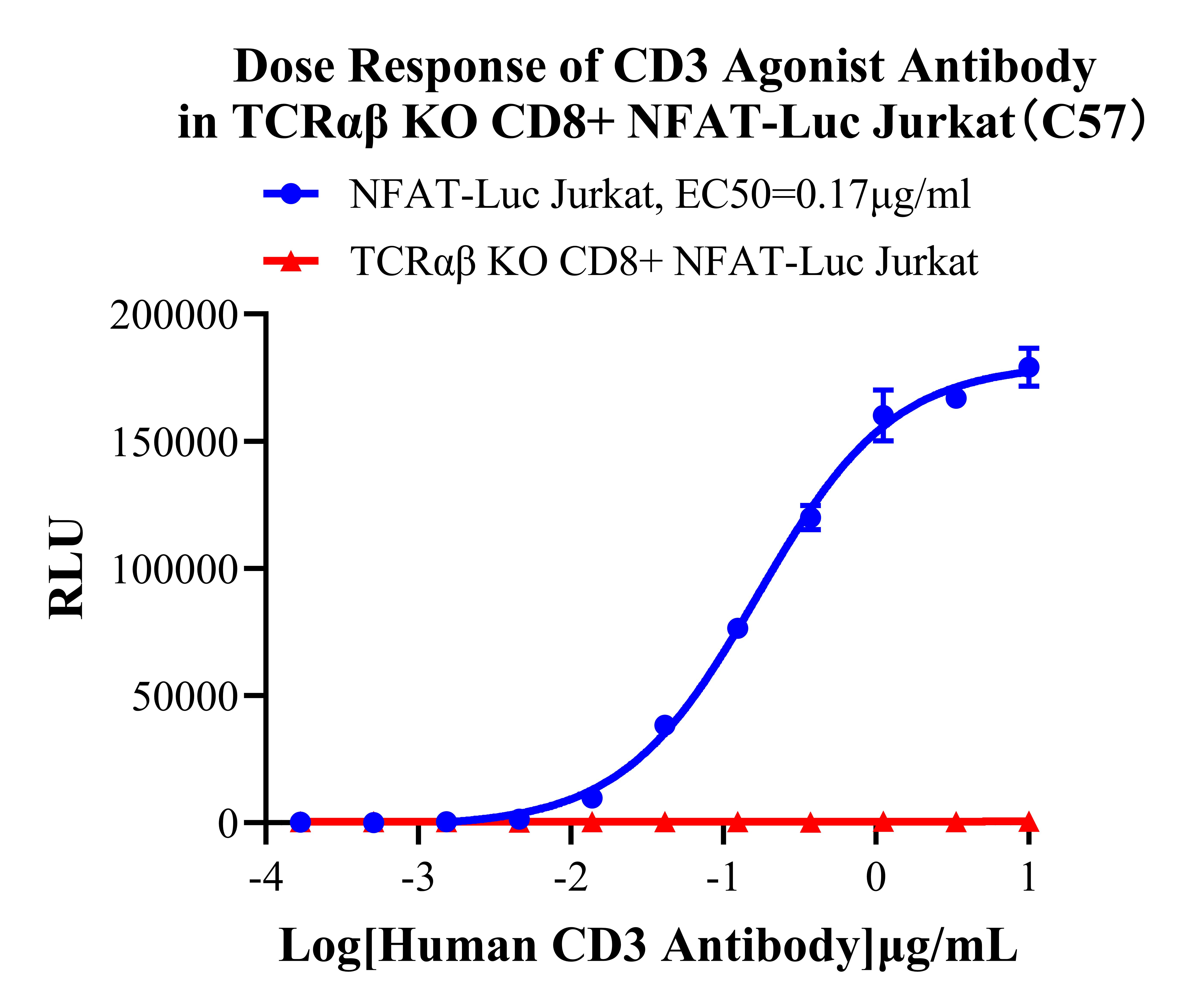 ![]() Figure 1. TCRαβ KO CD8+ NFAT-Luc Jurkat 細(xì)胞,在 NFAT-Luc Jurkat 細(xì)胞上敲除 TCRαβ,表達(dá)CD8。 ![]() Figure 2. Dose Response of CD3 Agonist Antibody in TCRαβ KO CD8+ NFAT-Luc Jurkat(C57). |