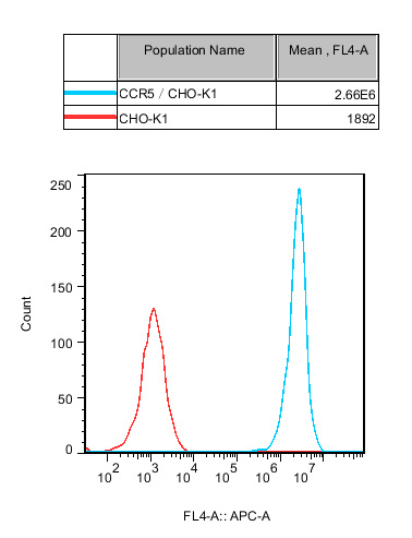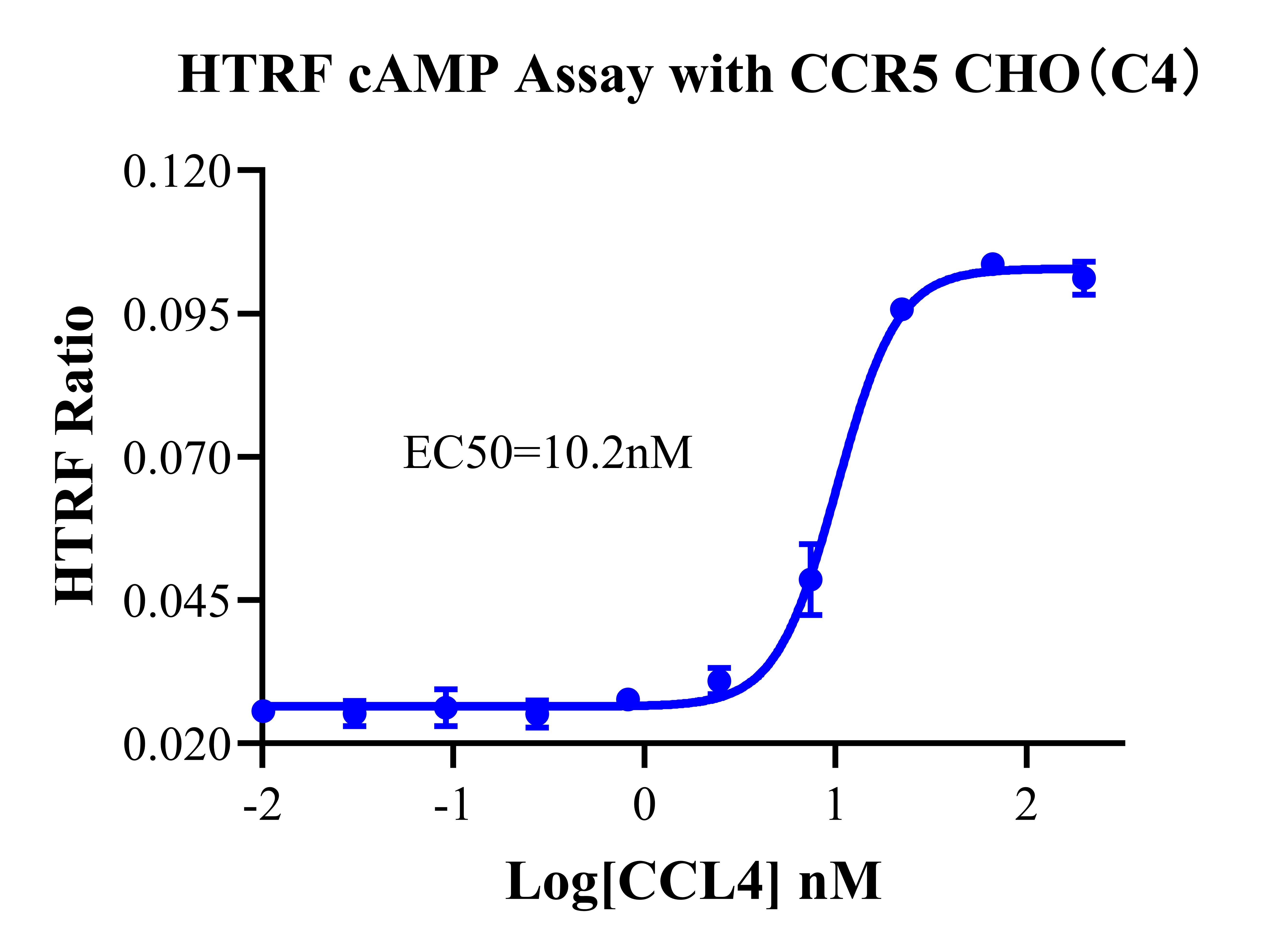 cAMP 在 G 蛋白偶聯(lián)受體(GPCR)信號(hào)轉(zhuǎn)導(dǎo)中是一種關(guān)鍵的第二信使。當(dāng)配體結(jié)合到 GPCR,構(gòu)象發(fā)生變化,激活受體接著激活G蛋白,Gi的激活導(dǎo)致腺苷酸環(huán)化酶調(diào)控 cAMP 的下調(diào)。CCR5 藥靶模型很好的模擬了體內(nèi) CCR5 的信號(hào)轉(zhuǎn)導(dǎo)過程,原理見下圖所示。![]() Figure 1. CCR5 CHO 細(xì)胞模型原理圖