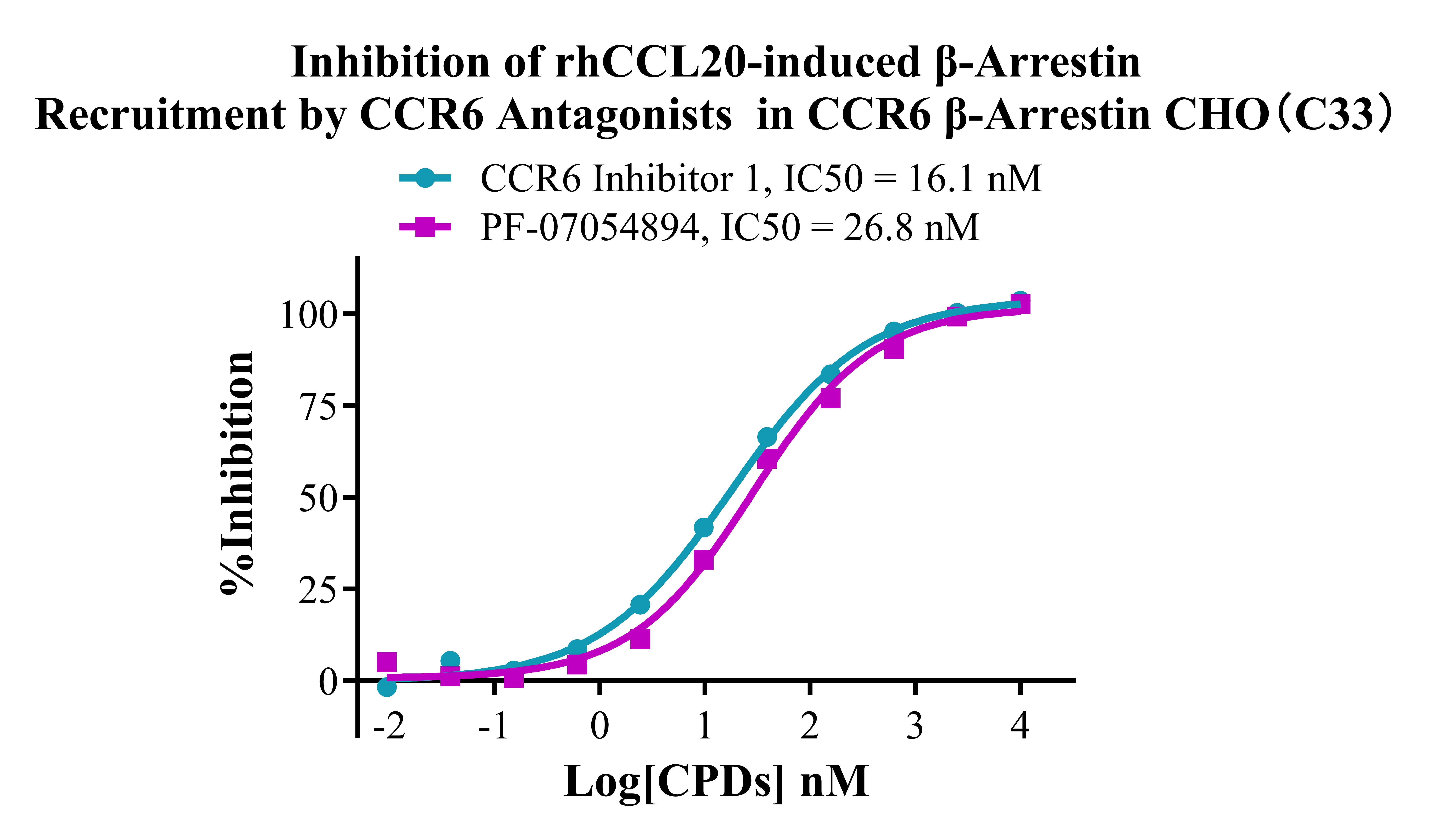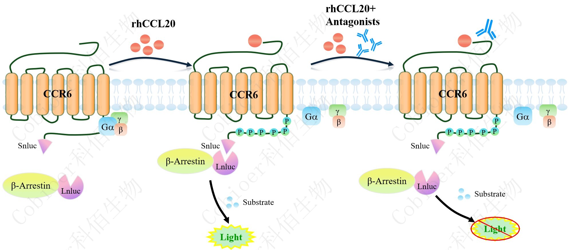 CCR6 β-Arrestin CHO 報(bào)告基因藥靶模型很好的模擬了體內(nèi) CCR6/β-Arrestin 的信號(hào)轉(zhuǎn) 導(dǎo)過(guò)程,原理見(jiàn)下圖所示。![]() Figure 1. CCR6 β-Arrestin CHO 細(xì)胞模型原理圖 |