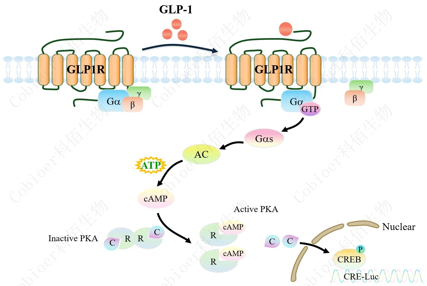 GLP1R CRE-Luc HEK293 報告基因藥靶模型很好的模擬了體內(nèi) GLP1R 的信號轉(zhuǎn)導過程,原理見下圖所示。