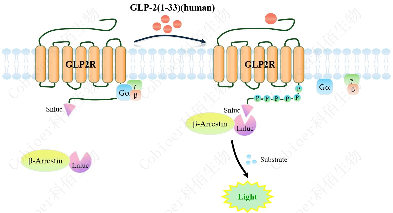 GLP2R β-Arrestin CHO 報(bào)告基因藥靶模型很好的模擬了體內(nèi) GLP2R/β-Arrestin 的信號(hào)轉(zhuǎn)導(dǎo)過(guò)程,原理見(jiàn)下圖所示。當(dāng)缺乏配體刺激時(shí),β-Arrestin 不與 GLP2R 結(jié)合,融合β- Arrestin 的熒光素酶處于失活構(gòu)象,當(dāng) GLP2R 遭遇配體刺激時(shí),融合熒光素酶報(bào)告基因的 β-Arrestin 被招募,使熒光素酶報(bào)告基因處于激活狀態(tài),加入其底物后發(fā)光信號(hào)增強(qiáng)。