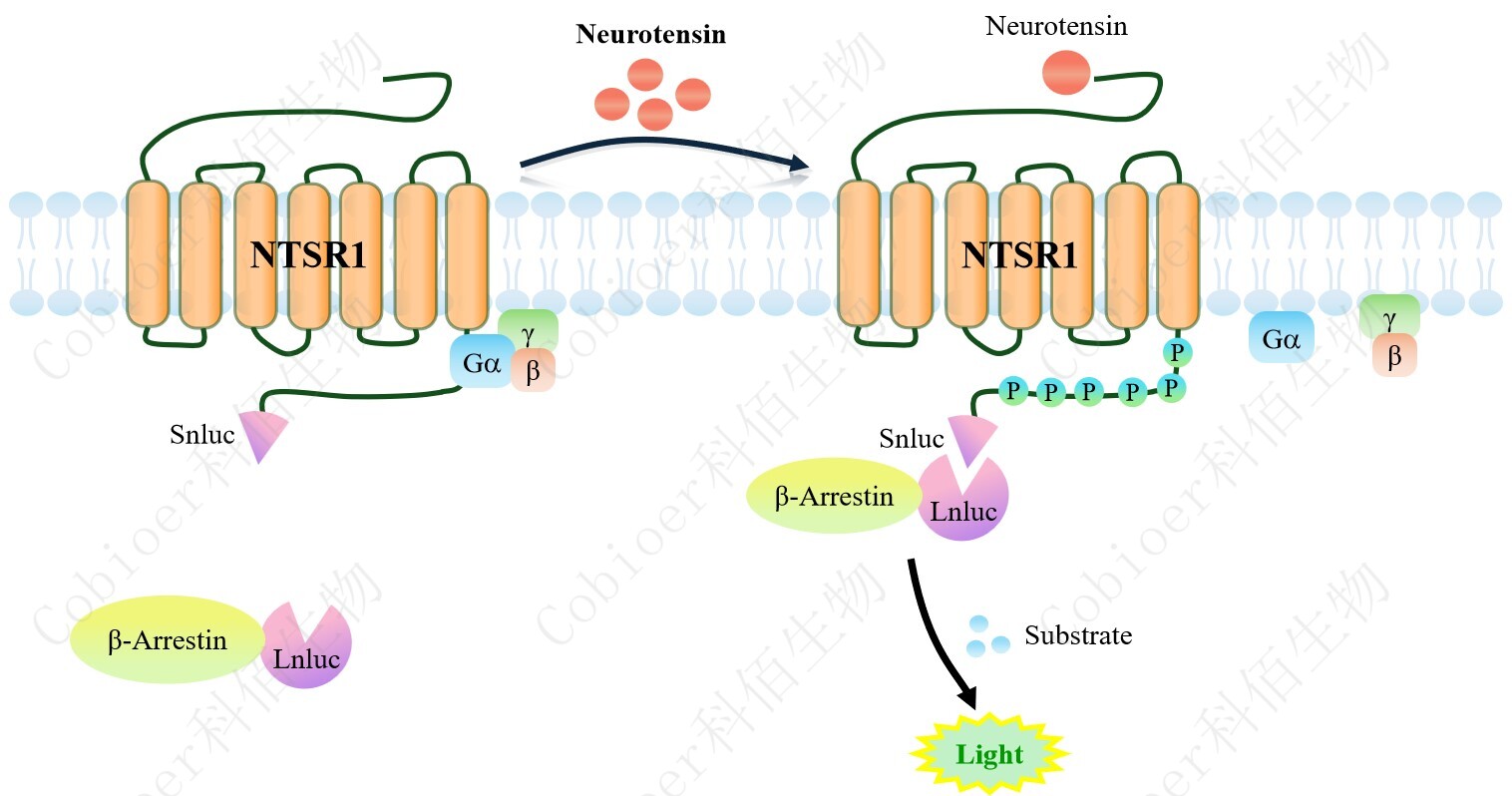 NTSR1 β-Arrestin CHO 報(bào)告基因藥靶模型很好的模擬了體內(nèi) NTSR1/β-Arrestin 的信號(hào) 轉(zhuǎn)導(dǎo)過(guò)程,原理見(jiàn)下圖所示。當(dāng)缺乏配體刺激時(shí),β-Arrestin 不與 NTSR1 結(jié)合,融合β- Arrestin 的熒光素酶處于失活構(gòu)象,當(dāng) NTSR1 遭遇配體刺激時(shí),融合熒光素酶報(bào)告基因的 β-Arrestin 被招募,使熒光素酶報(bào)告基因處于激活狀態(tài),加入其底物后發(fā)光信號(hào)增強(qiáng)。 ![]() Figure 1. NTSR1 β-Arrestin CHO 細(xì)胞模型原理圖 |