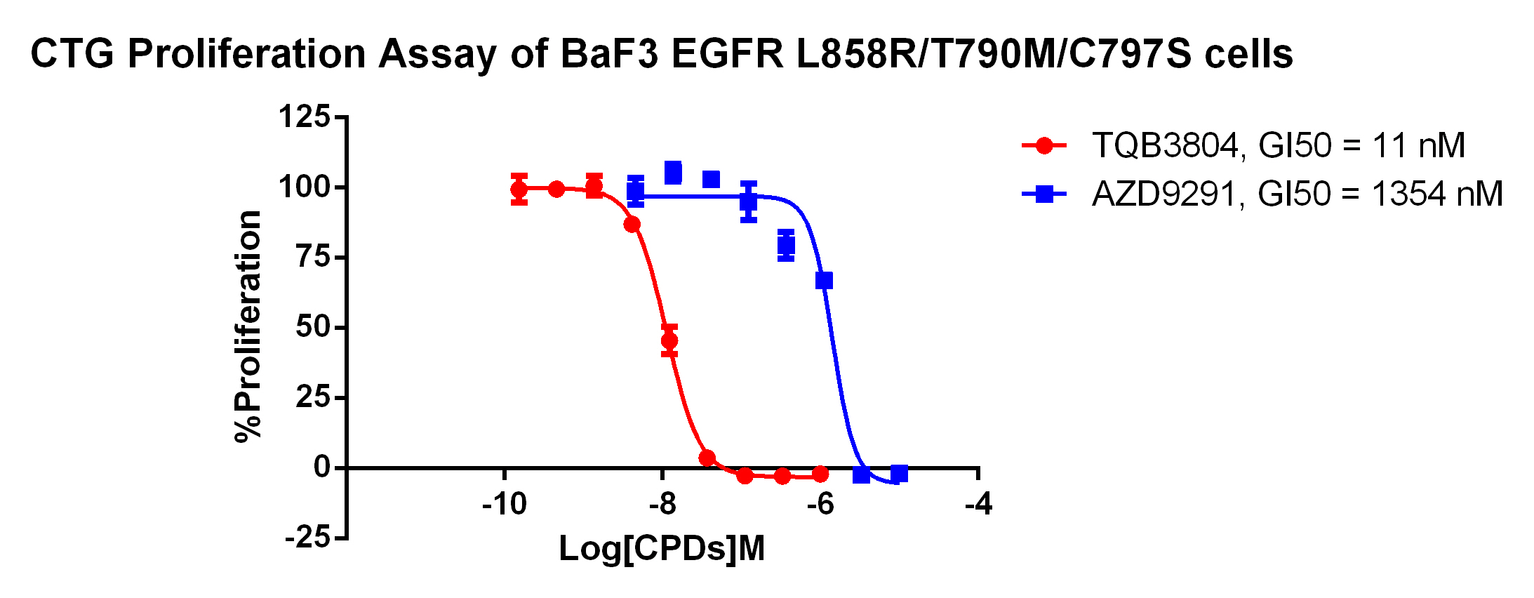 Figure 3. Anti-proliferation assay of three reference compounds on the EGFR L858R-T790M-C797S/BaF3 Stable Cell Line. |