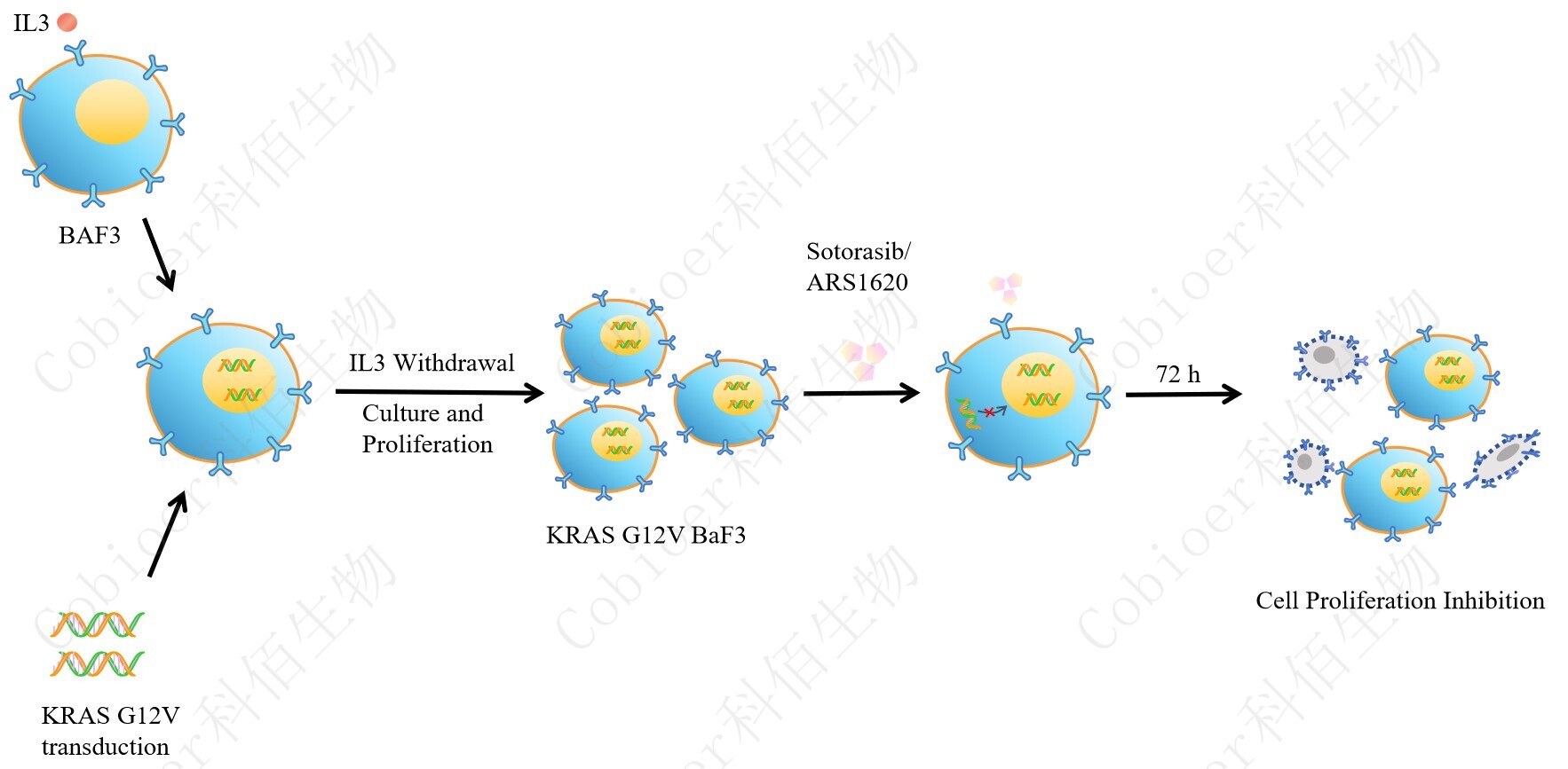 BaF3(小鼠原 B 細(xì)胞)的生長和增殖需要 IL-3 的維持。通過引入各種表達(dá)激酶的基因, 能作為 BaF3 的驅(qū)動基因,讓 BaF3 不再依賴 IL-3 而增殖,進(jìn)而激酶基因成為 BaF3 增殖依賴的驅(qū)動基因,用于評估小分子藥物對激酶的靶向抑制作用,原理及流程見下圖所示。