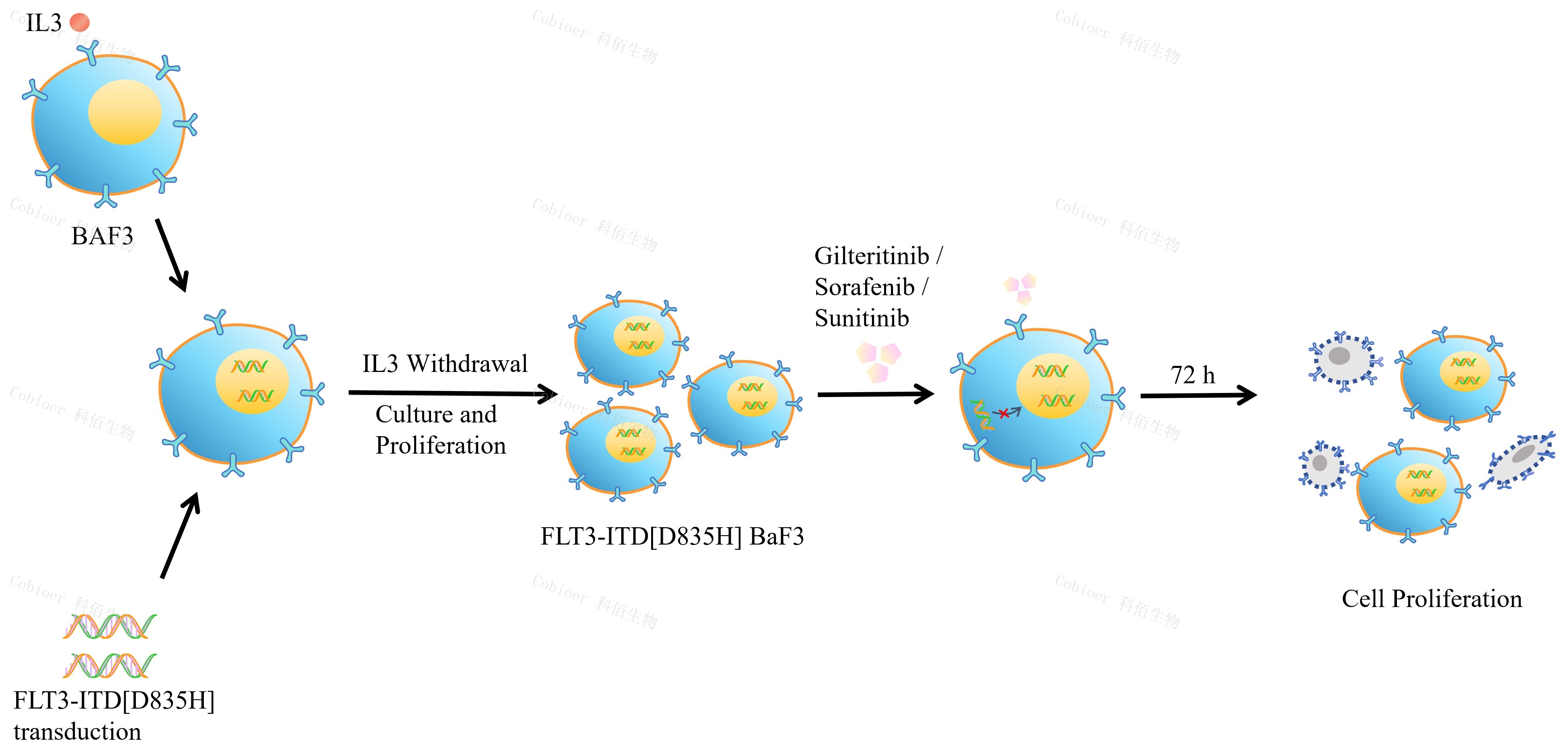 BaF3(小鼠原 B 細胞)的生長和增殖需要 IL-3 的維持。通過引入各種表達激酶的基因, 能作為 BaF3 的驅動基因,讓 BaF3 不再依賴 IL-3 而增殖,進而激酶基因成為 BaF3 增殖依賴的驅動基因,用于評估小分子藥物對激酶的靶向抑制作用,原理及流程見下圖所示。