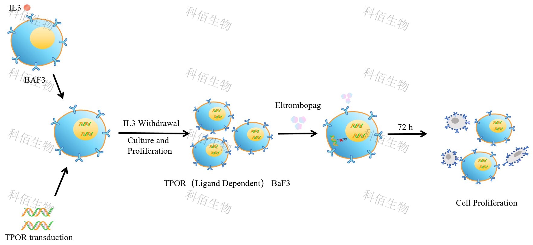 TPOR(Ligand Dependent) BaF3 藥靶細(xì)胞,通過轉(zhuǎn)導(dǎo)野生狀態(tài)的 TPOR 基 因到 BaF3 細(xì)胞系中,穩(wěn)定表達(dá)人野生形態(tài)下的 TPOR 基因。 BaF3(小鼠原 B 細(xì)胞)的生長和增殖需要 IL-3 的維持。通過引入各種表達(dá)激酶的基因, 能作為 BaF3 的驅(qū)動基因,讓 BaF3 不再依賴 IL-3 而增殖,進(jìn)而激酶基因成為 BaF3 增殖依賴的驅(qū)動基因,用于評估小分子藥物對激酶的靶向抑制作用,原理及流程見下圖所示。