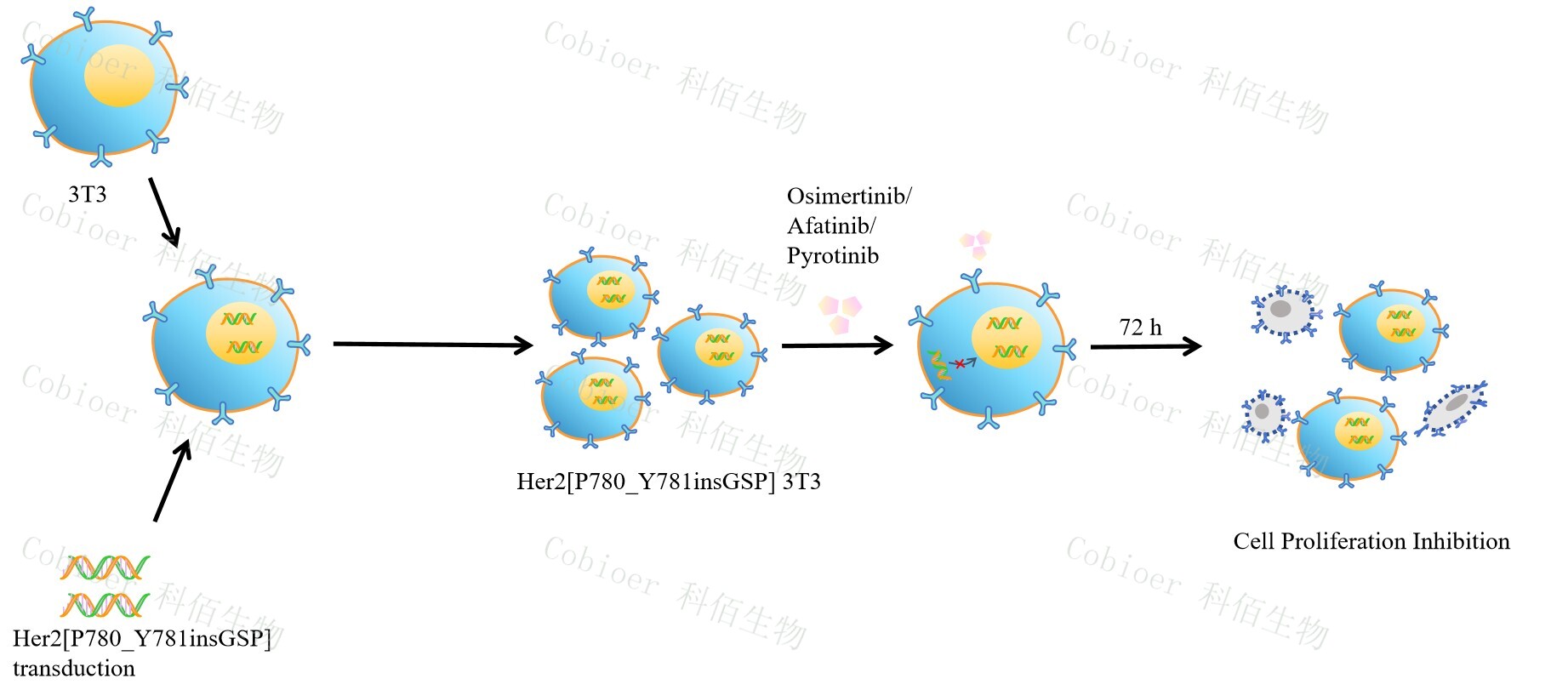HER2[P780_Y781insGSP] 3T3 藥靶細胞 , 通過轉(zhuǎn)導突變狀態(tài)的 HER2[P780_Y781insGSP] 基因到 3T3 細胞系中 , 穩(wěn)定表達人突變形態(tài)下的 HER2[P780_Y781insGSP]基因,原理及流程見下圖所示。![]() Figure 1. HER2[P780_Y781insGSP] 3T3 細胞的構建原理圖 |