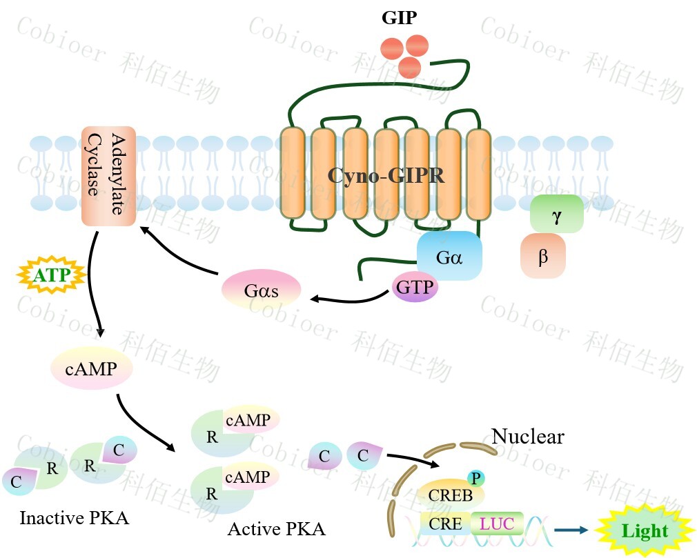Cyno GIPR CRE-Luc HEK293 報(bào)告基因藥靶模型很好的模擬了體內(nèi) GIPR 的信號(hào)轉(zhuǎn)導(dǎo)過(guò)程,原理見(jiàn)下圖所示。
