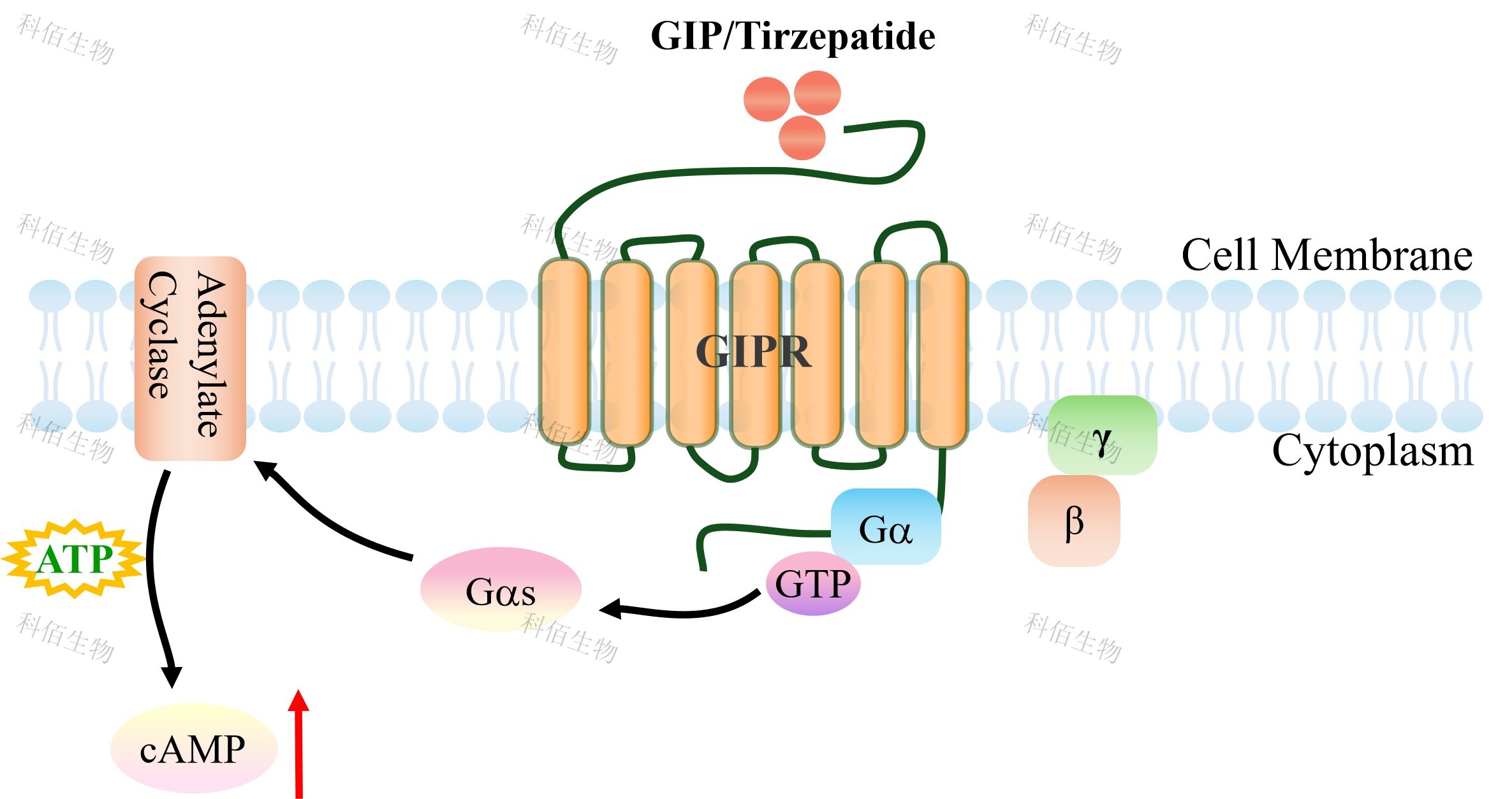 cAMP 在 G 蛋白偶聯(lián)受體(GPCR)信號(hào)轉(zhuǎn)導(dǎo)中是一種關(guān)鍵的第二信使。當(dāng)配體結(jié)合到 GPCR,構(gòu)象發(fā)生變化,激活受體接著激活G蛋白,Gs的激活導(dǎo)致腺苷酸環(huán)化酶調(diào)控cAMP 的升高。GIPR 藥靶模型很好的模擬了體內(nèi) GIPR 的信號(hào)轉(zhuǎn)導(dǎo)過(guò)程,原理見下圖所示。