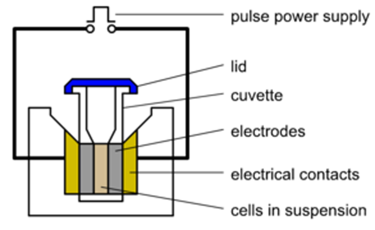 體外電穿孔時(shí),將靶細(xì)胞懸浮液與待導(dǎo)入細(xì)胞的質(zhì)粒DNA在導(dǎo)電溶液中混合,然后放入比色皿中(圖1)。電穿孔比色皿的樣品室兩側(cè)各有一塊金屬板,電流可以通過(guò)混合物。將比色皿放入電穿孔儀的腔室中,該腔室配有相應(yīng)的電觸點(diǎn),使比色皿形成電路。電穿孔儀上的控制器允許用戶(hù)設(shè)置待輸送電脈沖的電壓、波形和持續(xù)時(shí)間,這些參數(shù)應(yīng)根據(jù)靶細(xì)胞類(lèi)型進(jìn)行優(yōu)化。然后,電脈沖通過(guò)樣品室。
