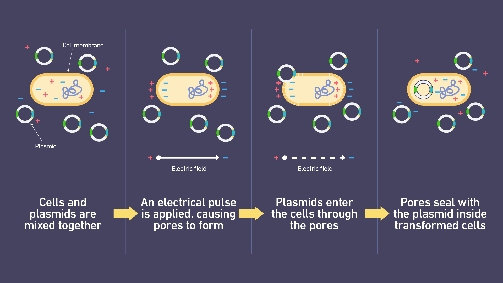 電脈沖擾亂細(xì)胞膜的磷脂雙層,從而形成孔隙(圖 2)。這種過(guò)程是不對(duì)稱(chēng)的,孔隙首先在細(xì)胞的陽(yáng)極側(cè)形成。同時(shí),跨膜電位增加。這驅(qū)使帶電分子(例如質(zhì)粒DNA)首先吸附到細(xì)胞陰極側(cè)的膜上,然后穿過(guò)這些孔隙進(jìn)入細(xì)胞 (圖 3)。