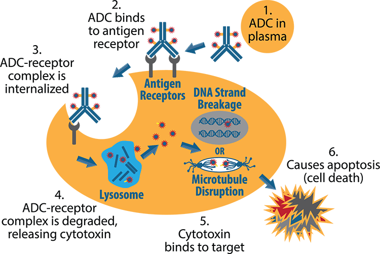 ADC藥物通過靜脈注射到血液中,隨著血液的流動,到達全身,但是科學(xué)家估計只有0.1%的ADC能到達患者的癌細胞。大部分會在循環(huán)系統(tǒng)和其他器官及組織中逐漸分解。到達癌細胞的ADC藥物一般是經(jīng)歷6個過程來起作用。