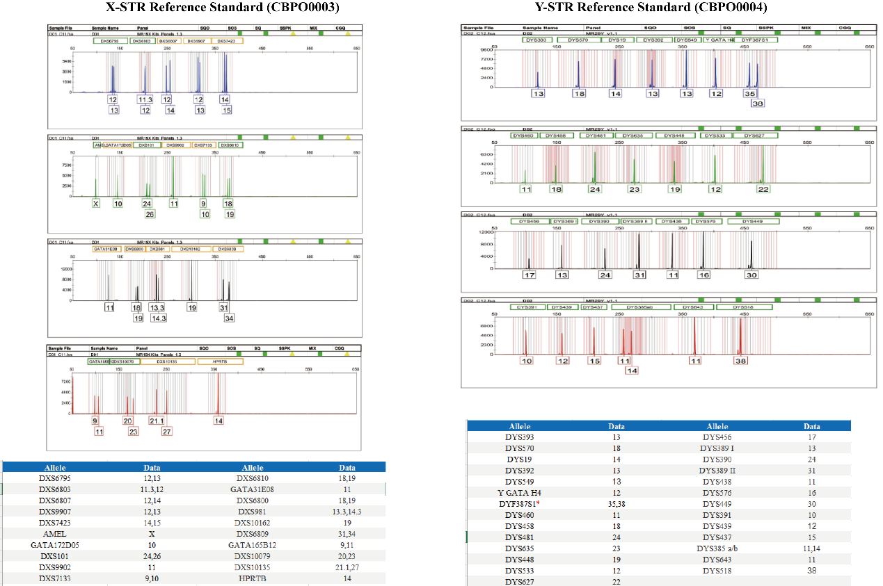 X染色體標準品包含19個X-STR基因座和一個性別位點Amelogenin。Y染色體標準品包含22個低頻突變Y-STR基因座和7個高頻突變Y-STR基因座。低頻突變和高頻突變基因座相結合具有更高的個體識別能力,提供了強大的兼容性和排查能力。