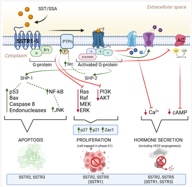 SSTR2與其它同家族受體一樣,在結合內源性多肽配體SST后可以與Gi蛋白偶聯,通過調節(jié)腺苷酸環(huán)化酶活性進而抑制環(huán)腺苷酸的合成,將外源信號傳遞至胞內,從而參與調節(jié)多種激素的分泌,抑制細胞生長增殖。SSTR還能激活K+ 通道,促進細胞膜超極化,抑制門控Ca2+通道的激活,進而阻礙Ca2+內流,抑制胞吐,抑制荷爾蒙的分泌功能。當SSTR2或其它亞型與SST結合后,可以通過蛋白酪氨酸磷酸途徑,SSTR導致蛋白酪氨酸磷酸酶(PTP)上調,使酪氨酸激酶去磷酸化而失活,并抑制促絲裂原活化蛋白激酶(MAPK)等多種蛋白激酶,抑制癌基因、c-fos、c-mys、c-jun等轉錄激活,從而抑制DNA和蛋白質的合成。
