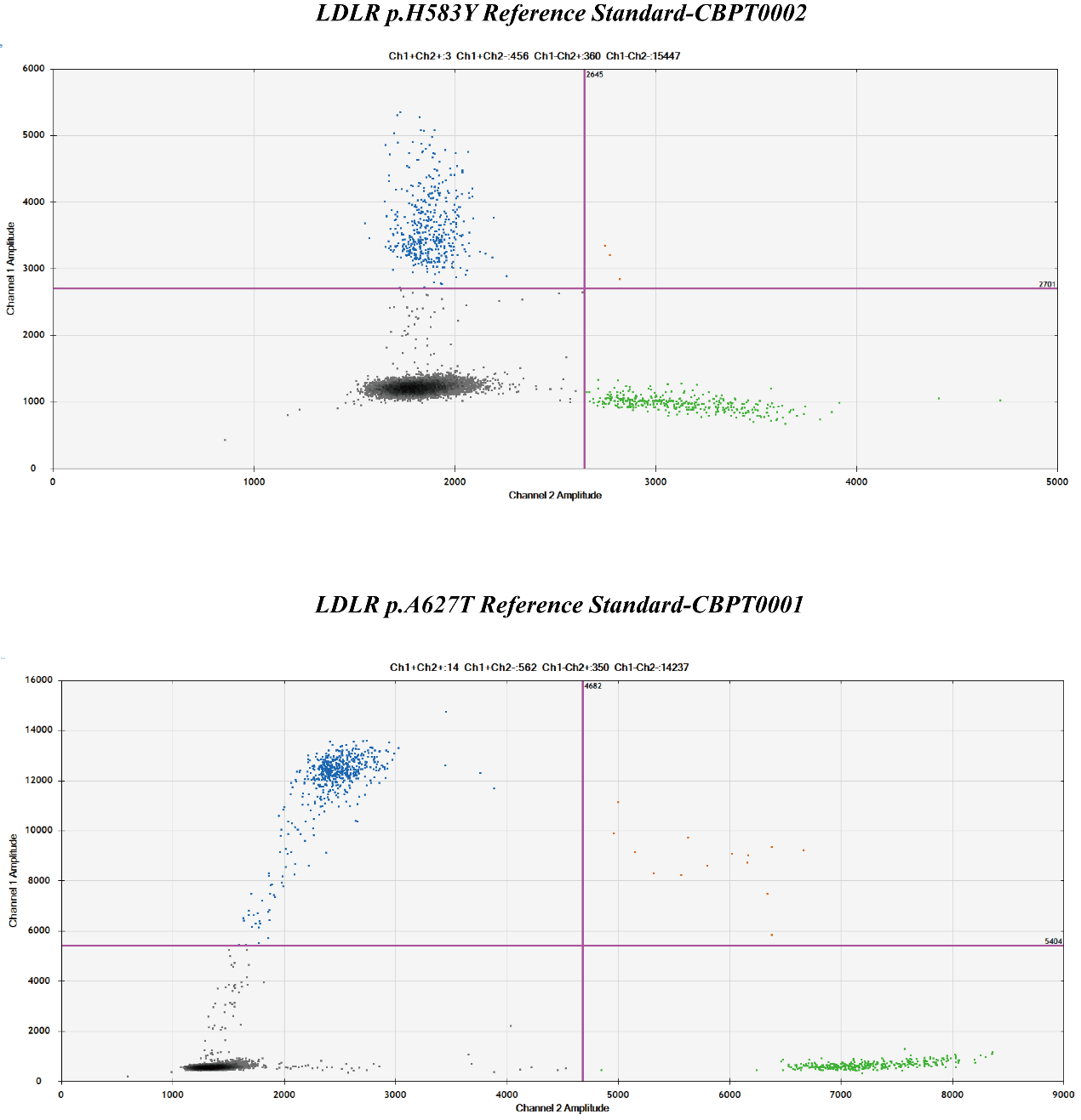 Fig 1. Results of dPCR with LDLR p.H583Y Reference Standard and LDLR p.A627T Reference Standard.
