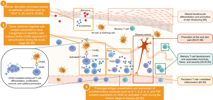 雖然目前對(duì)特應(yīng)性皮炎(AD)的具體情況知之甚少,但OX40可能在特應(yīng)性皮炎(AD)發(fā)展的幾個(gè)階段都很重要。在特應(yīng)性皮炎(AD)的急性期,OX40信號(hào)可能參與了Th2型 T細(xì)胞驅(qū)動(dòng)的炎癥,放大了皮膚屏障的破壞和瘙癢等癥狀的發(fā)展。在早期發(fā)病過(guò)程中,朗格漢斯細(xì)胞和炎性樹(shù)突狀表皮細(xì)胞識(shí)別通過(guò)被破壞的表皮屏障穿透皮膚的外來(lái)抗原,隨后啟動(dòng)Th2細(xì)胞。屏障破壞的角質(zhì)形成細(xì)胞也可以產(chǎn)生細(xì)胞因子,如胸腺基質(zhì)淋巴生成素(TSLP)、IL-25和IL-33。由于這些分子已被證明可以刺激APC表達(dá)OX40L,這可以通過(guò)增強(qiáng)傳遞給T細(xì)胞的OX40信號(hào)來(lái)進(jìn)一步增強(qiáng)T細(xì)胞的擴(kuò)增和分化。同樣,OX40L也被發(fā)現(xiàn)可以誘導(dǎo)ILC2,而ILC2也受這些先天細(xì)胞因子的調(diào)節(jié),ILC2和T細(xì)胞之間涉及OX40L和OX40的相互作用也可能有助于Th2細(xì)胞的初始啟動(dòng)。激活的Th2細(xì)胞上調(diào)IL-14、IL-13和IL-31的產(chǎn)生,進(jìn)而通過(guò)抑制屏障相關(guān)基因(如角化細(xì)胞終末分化基因聚絲蛋白)的表達(dá)破壞表皮屏障功能,促進(jìn)表皮增生。IL-4和IL-13結(jié)合在T細(xì)胞、B細(xì)胞、巨噬細(xì)胞和其他免疫細(xì)胞上表達(dá)的IL-4Rα,促進(jìn)炎癥和免疫球蛋白E類轉(zhuǎn)換。感覺(jué)神經(jīng)元表達(dá)皮膚細(xì)胞和免疫細(xì)胞釋放的各種細(xì)胞因子的受體,包括IL-4、IL-13、IL-31和TSLP,將瘙癢和疼痛信號(hào)傳遞到中樞神經(jīng)系統(tǒng),引起特應(yīng)性瘙癢、疼痛和抓撓。