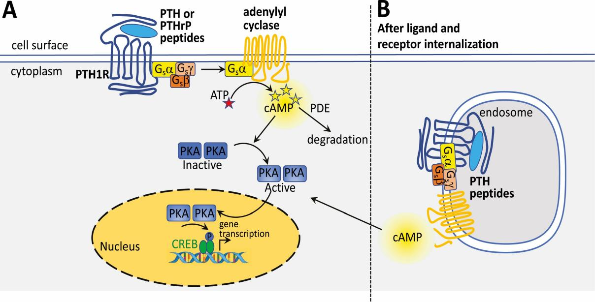 PTH1R的核心結構包括N端胞外結構域(ECD)、7次跨膜結構域(7TMD,由七個跨膜α螺旋和連接環(huán)組成)和C端胞內(nèi)結構域。PTH 或 PTHrP 的氨基末端肽與PTH1R的ECD結合后,會導致 G 蛋白的激活,主要是 Gα,它激活腺苷酸環(huán)化酶,并以磷酸二酯酶限制的方式催化 cAMP 的產(chǎn)生。當達到足夠的局部細胞內(nèi)濃度時,cAMP 激活 PKA,PKA 易位到細胞核,在核內(nèi)磷酸化 CREB,從而能夠在特定基因上轉(zhuǎn)錄 cAMP 響應元件,從而調(diào)控成骨細胞分化和鈣磷代謝。PTH1R 信號傳導可以發(fā)生在細胞表面,或者對于 PTH 氨基末端肽,它也可以發(fā)生在配體和受體內(nèi)化后。