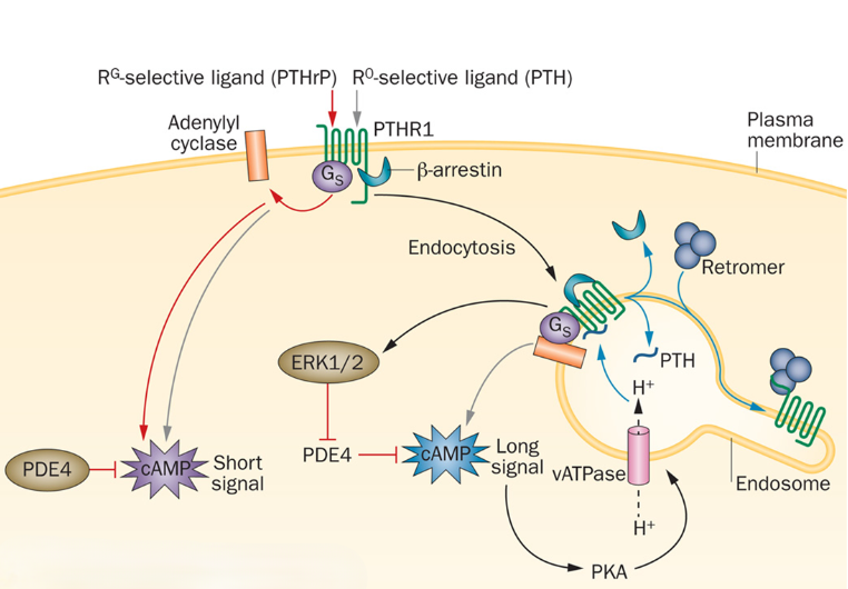 PTH1R與β-arrestin(特別是β-arrestin-1)結合后,可激活ERK-1/2/MAPK通路,延長cAMP信號的持續(xù)時間,并促進細胞外信號響應。內(nèi)體信號傳導的終止與逆轉(zhuǎn)錄聚體分選蛋白的 β-抑制素復合物交換相關,并受到 vATP 酶介導的囊泡酸化的促進。vATP酶被cAMP依賴性PKA激活,從而建立負反饋回路。PTH1R 激活細胞內(nèi)持續(xù)時間和起源位置不同的 cAMP 信號傳導為配體定向的細胞反應多樣化提供了潛在機制。這一通路既可通過G蛋白依賴途徑,也可通過G蛋白非依賴的β-arrestin直接激活。值得注意的是,β-arrestin依賴性信號在骨代謝中具有獨特作用,例如通過β-arrestin介導的ERK激活,促進成骨細胞合成代謝,且不刺激骨吸收,對于骨的合成代謝發(fā)揮獨特的生理功能。