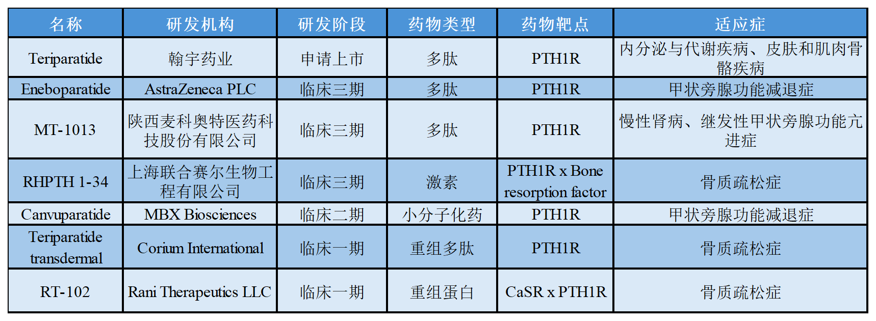 關于PTH1R,目前常用的靶向療法主要聚焦于PTH1R的激動劑與拮抗劑,已有多款藥物批準上市:Ascendis Pharma A/S 研發(fā)的帕羅培特立帕肽、Sawai Pharmaceutical研發(fā)的特立帕肽、Ipsen SA研發(fā)的阿巴帕肽等。