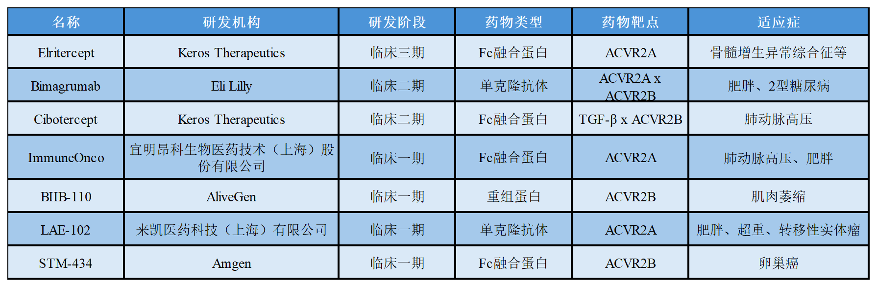 關(guān)于ActRⅡ在研的部分藥物進(jìn)展如下表所示: