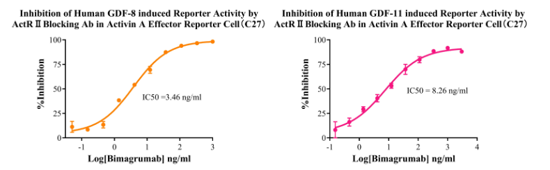 Figure 4. Inhibition of Human GDF-8 induced Reporter Activity by ActR II Blocking Ab in Activin A Effector Reporter Cell(C27). Inhibition of Human GDF-11 induced Reporter Activity by ActR II Blocking Ab in Activin A Effector Reporter Cell(C27).