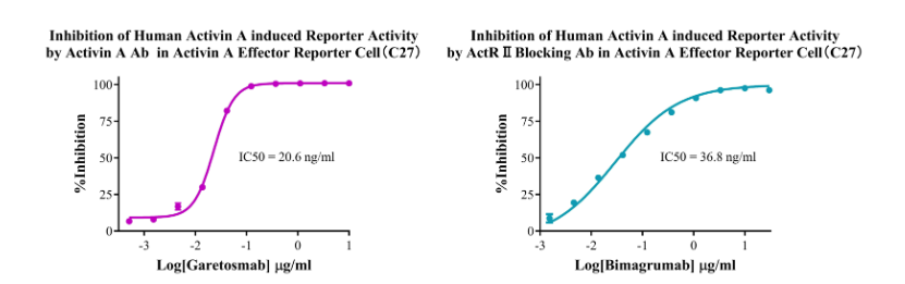 Figure 5. Inhibition of Human Activin A induced Reporter Activity by Activin A Ab in Activin A Effector Reporter Cell(C27). Inhibition of Human Activin A induced Reporter Activity by ActR II Blocking Ab in Activin A Effector Reporter Cell(C27).