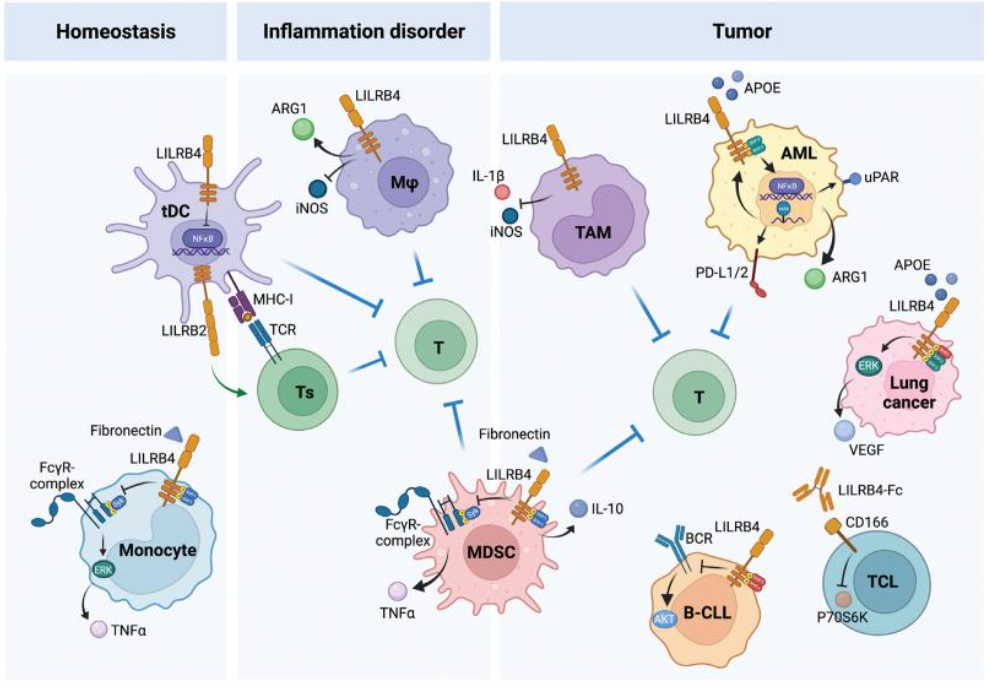 LILRB4可通過NF-kB信號傳導(dǎo)導(dǎo)致細(xì)胞凋亡,并通過降低磷酸酶(SHP)1磷酸化激活NF-kB信號傳導(dǎo)導(dǎo)致炎癥。LILRB4在多種腫瘤細(xì)胞中表達(dá),包括實(shí)體瘤和血液腫瘤。LILRB4還是單核細(xì)胞白血病的重要標(biāo)志物,通過ApoE/LILRB4/SHP-2信號軸在急性髓系白血?。ˋML)細(xì)胞中支持腫瘤細(xì)胞浸潤到組織中并抑制T細(xì)胞活性。因此,LILRB4是治療單核細(xì)胞急性髓細(xì)胞白血病的重要靶點(diǎn)。在肺癌細(xì)胞中,LILRB4被APOE結(jié)合激活,并募集SHP-2和SHIP-1激活ERK1/2信號傳導(dǎo)并增加血管內(nèi)皮生長因子(VEGF)的表達(dá)以促進(jìn)癌癥轉(zhuǎn)移。