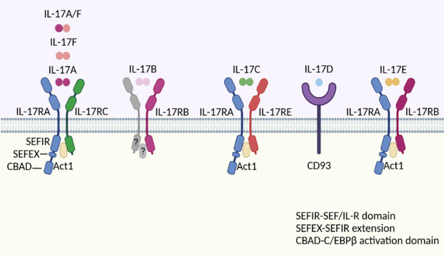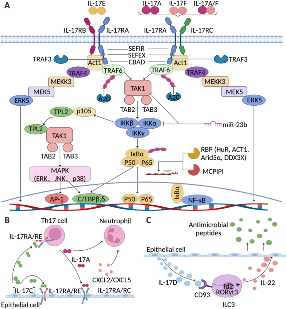 IL-17 細(xì)胞因子具有一個(gè)半胱氨酸環(huán)結(jié)構(gòu),它們會與特定的 IL-17R 受體結(jié)合,通過 SEFIR、SEFEX 和 CBAD 結(jié)構(gòu)域激活免疫信號傳導(dǎo)。IL-17 信號傳導(dǎo)始于 IL-17A/A、IL-17A/F 或 IL-17F/F 細(xì)胞因子與其受體(IL-17RA 和 IL-17RC)的結(jié)合,或者 IL-17E/E 細(xì)胞因子與其受體(IL-17RA 和 IL-17RB)的結(jié)合。當(dāng)配體結(jié)合后,Act1 會激活多種獨(dú)立的信號傳導(dǎo)途徑,這些途徑通過不同的 TRAF 蛋白介導(dǎo)。TRAF6 的激活會導(dǎo)致 NF-κB、C/EBPβ、C/EBPδ 和 MAPK 信號通路的觸發(fā)。IL-17R-Act1 復(fù)合物還通過 TRAF4 與 MEKK3 和 MEK5 結(jié)合,從而激活 ERK5。不同類別的抑制劑,如泛素酶(TRAF3)、去泛素酶(A20)、RBP(HuR、ACT1、Aridα 和 DDX3X)、內(nèi)切核糖核酸酶(MCPIP1/Regnase-1)和微小 RNA(miR-23b),通過各種獨(dú)立的機(jī)制負(fù)向調(diào)節(jié) IL-17 信號傳導(dǎo)。IL-17C 主要由上皮細(xì)胞表達(dá)。當(dāng) IL-17RA/RE 受體復(fù)合物表達(dá)時(shí),上皮細(xì)胞本身和 TH17 細(xì)胞都是 IL-17C 的作用靶點(diǎn)。除了增加 Th17 細(xì)胞中 IL17A 的表達(dá)外,IL-17C 還通過間接方式增強(qiáng)吸引中性粒細(xì)胞的趨化因子在上皮細(xì)胞中的表達(dá),最終導(dǎo)致強(qiáng)烈的炎癥反應(yīng)。