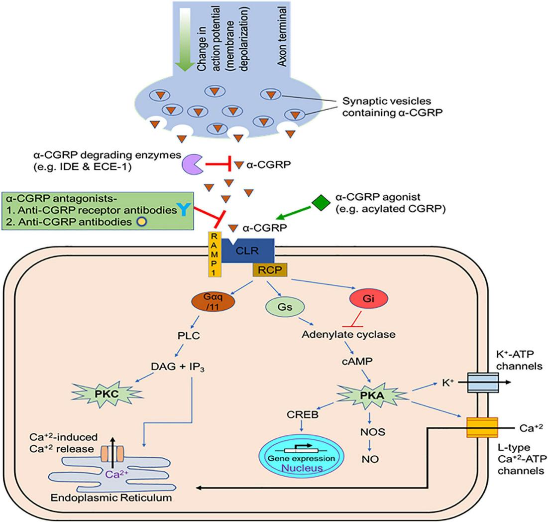 降鈣素基因相關(guān)肽(calcitonin gene-related peptid,CGRP)是一個含有37個氨基酸殘基的感覺神經(jīng)源性多肽,分為α-CGRP和β-CGRP兩個亞型,廣泛分布于中樞神經(jīng)系統(tǒng)(主要是三叉神經(jīng)血管系統(tǒng)、丘腦和小腦)。CGRP是一種強效的血管擴張劑,它主要由感覺神經(jīng)(如三叉神經(jīng))釋放。CGRP釋放后與腦血管平滑肌細胞表面的CGRP受體結(jié)合,引起腦血管擴張。CGRP受體的結(jié)構(gòu)主要包括:降鈣素受體樣受體(CALCRL)、活性修飾蛋白受體(RAMP)及結(jié)構(gòu)蛋白受體(RCP)。CGRP受體復(fù)合物是一種G蛋白偶聯(lián)受體,通過激活蛋白激酶A系統(tǒng),參與疼痛信息的病理調(diào)控過程。