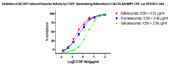 Figure 5. Inhibition of βCGRP induced Reporter Activity by CGRP Neutralizing Antibodies in CALCRL&RAMP1 CRE Luc HEK293 Cells.
