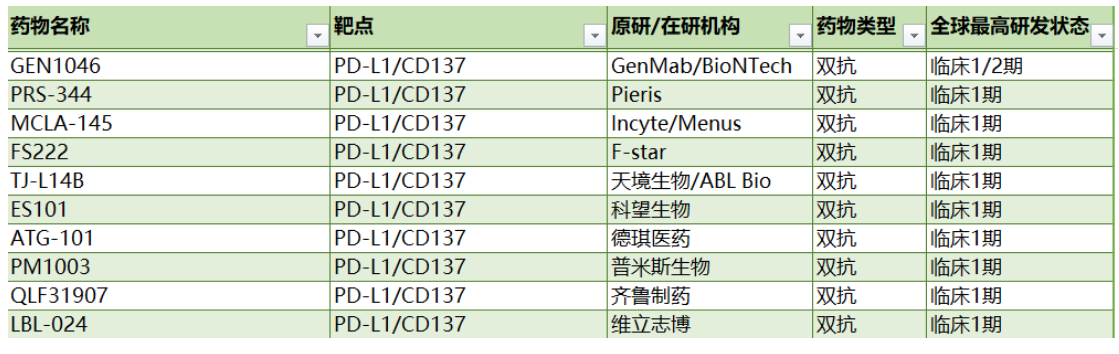 由于4-1BB在高度耗竭的PD-1高表達(dá)CD8+TIL上顯著表達(dá),并且在PD-1阻斷后進(jìn)一步上調(diào),而4-1BB信號(hào)傳導(dǎo)則會(huì)誘導(dǎo)CD8+TIL的克隆擴(kuò)增,CD8+TIL表現(xiàn)出腫瘤反應(yīng)性而無(wú)終末分化,因此4-1BB和PD-L1可能是誘導(dǎo)T細(xì)胞抗腫瘤反應(yīng)機(jī)制上的一對(duì)好搭檔。針對(duì)這兩者開(kāi)發(fā)雙特異性抗體是一種極具前景的開(kāi)發(fā)策略,引得國(guó)內(nèi)外玩家紛紛參與,目前已有十余款針對(duì)PD-L1/4-1BB的雙抗藥物處于不同的研發(fā)介段,下表列舉了部分已進(jìn)入臨床的雙抗藥物: