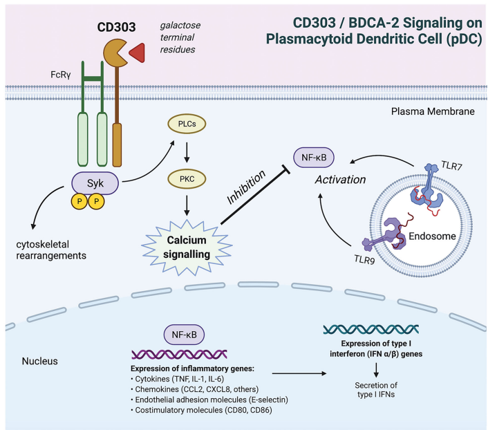 BDCA-2 (blood DC antigen 2血液樹突狀細(xì)胞抗原2)又叫CLEC4C或CD303,是人類pDCs特有的II型c型凝集素受體(CLR),與TLR-7/9協(xié)同識別微生物和協(xié)調(diào)炎癥免疫反應(yīng)。BDCA-2是一種可溶性跨膜糖蛋白,由聚集在12號染色體上的c型凝集素編碼基因編碼,包括KLRG1和CLEC4A。與其他CLR類似,BDCA-2具有單個胞外碳水化合物識別結(jié)構(gòu)域,并且在其短細(xì)胞質(zhì)尾部缺乏固有的信號基序。BDCA-2選擇性地與IgG分子上的半乳糖端聚糖結(jié)合,產(chǎn)生抗炎反應(yīng)來抵抗因為通過抗原吸收、內(nèi)化、呈遞給T細(xì)胞以及信號通路如IFN-I,NF-kB等其他炎性體激活。BDCA-2與跨膜區(qū)的FcRγ鏈形成adaptor,允許酪氨酸激酶募集磷酸化以及鈣動員,類似于b細(xì)胞受體(BCR)信號體,BDCA-2信號通過免疫受體酪氨酸激活發(fā)生基序(ITAM)介導(dǎo)的酪氨酸(Syk)磷酸化,磷脂酰肌醇特異性磷酯酶(PLCγ2),PKC的激活等誘導(dǎo)鈣流入并在pDC中充當(dāng)負(fù)調(diào)節(jié)劑,介導(dǎo)IFN-Ⅰ抑制并通過BDCA2觸發(fā)減少NFKB的激活。