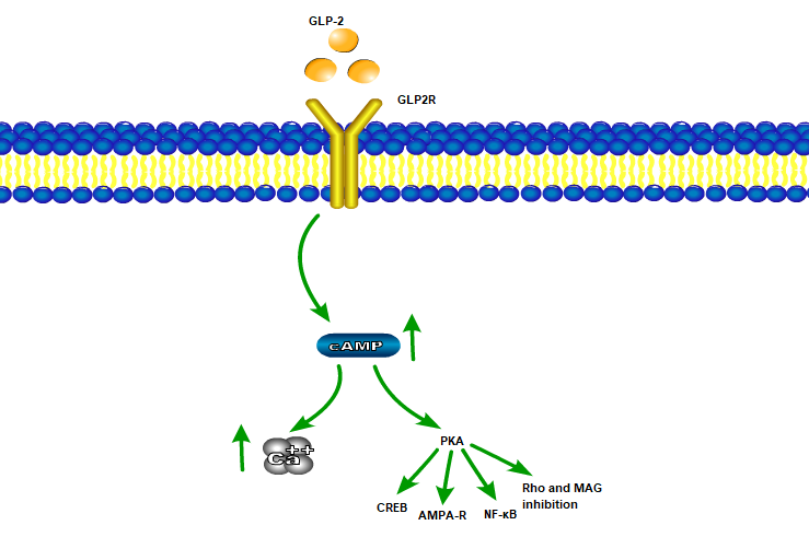 胰高血糖素樣肽2受體(glucagon like peptide 2 receptor, GLP2R)屬于G蛋白偶練受體超家族,是胰高血糖素受體家族的成員,同GLP-1、胰高血糖素和GIP的受體有較高的同源性。人GLP2R基因定位于染色體17p13.3,編碼553個氨基酸。GLP2R主要表達于胃腸道中,GLP-2是一種有效的腸道生長因子,結(jié)合GLP-2R后,激活腺苷酸環(huán)化酶,呈劑量依賴性的產(chǎn)生大量cAMP,激活PKA,從而使cAMP反應(yīng)元件(CRE)和AP-1 依賴的轉(zhuǎn)錄增加,使被調(diào)控基因的表達發(fā)生變化。